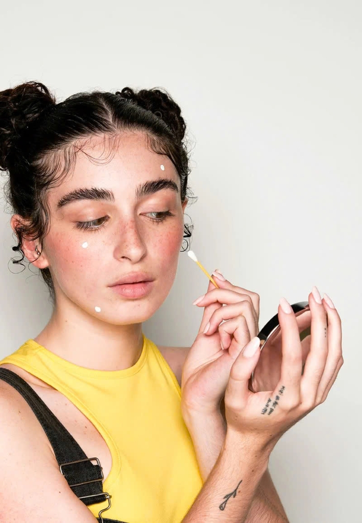Sau khi làm sạch và dùng toner cho da, nhúng tăm bông Zitswab® (hoặc tăm bông sạch) xuống tận đáy lọ để lấy cả phần bột lắng và dung dịch.