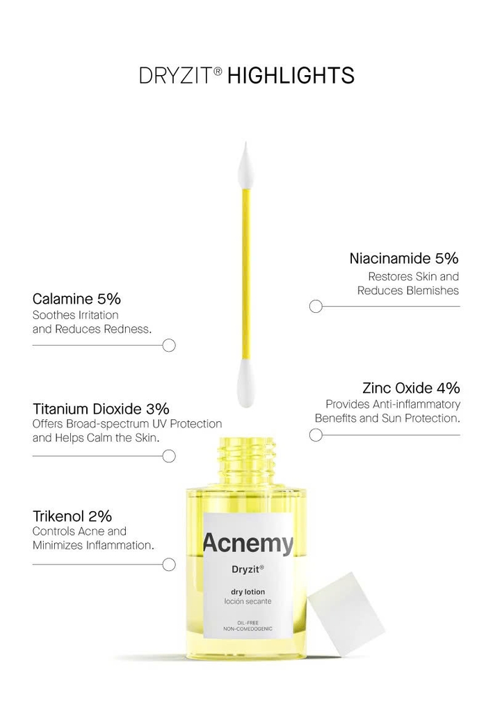 ACNEMY DRYZIT® SPOT DRYING LOTION là sản phẩm chuyên biệt dạng chấm, được thiết kế để hỗ trợ làm khô các nốt mụn viêm, mụn mủ nhanh chóng. Với công thức hai lớp độc đáo, sản phẩm hoạt động hiệu quả để làm sạch da, loại bỏ tế bào chết và giảm thiểu tình trạng kích ứng, mang lại làn da trông mịn màng và khỏe mạnh hơn. Dryzit® là lựa chọn lý tưởng cho làn da có xu hướng nổi mụn, giúp bạn nhanh chóng lấy lại vẻ tự tin.