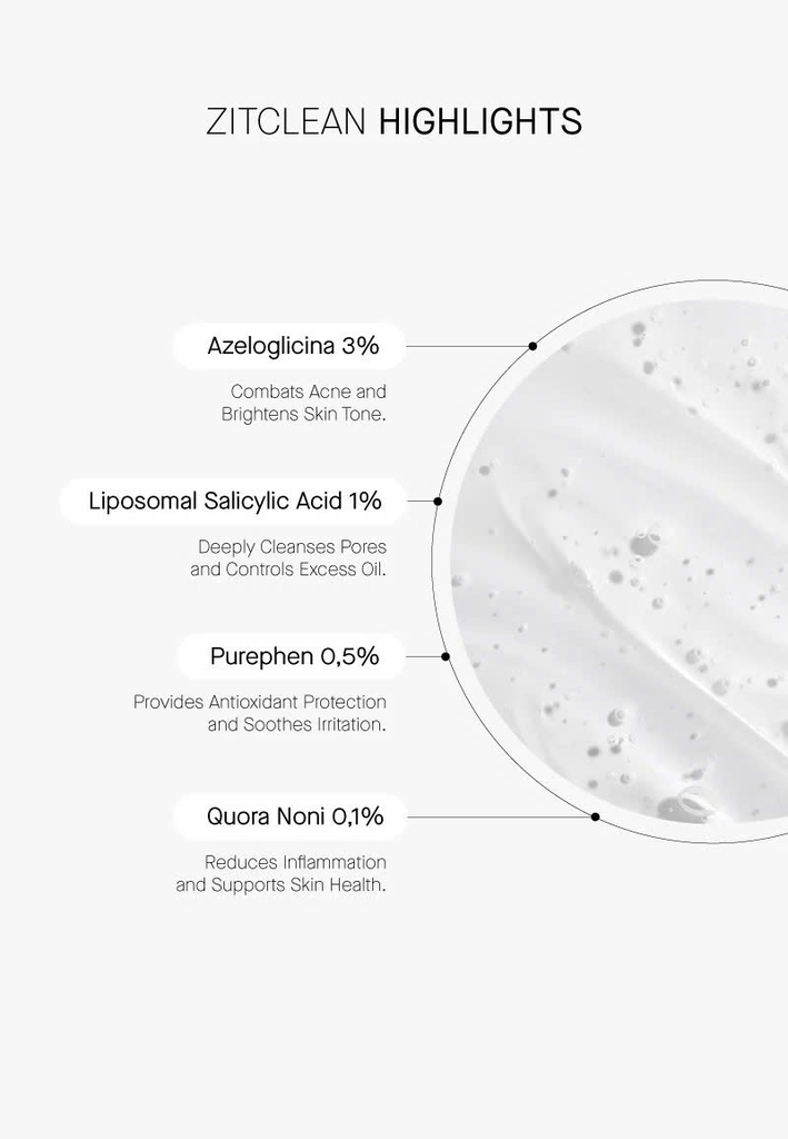 ACNEMY ZITCLEAN® PURIFYING CLEANSING GEL là gel làm sạch sâu được thiết kế đặc biệt cho làn da có xu hướng dễ nổi mụn. Sản phẩm sở hữu công thức dịu nhẹ với hàm lượng chất hoạt động bề mặt dưới 10%, giúp làm sạch hiệu quả mà không gây kích ứng hay làm khô da. Zitclean® thanh lọc da, kiểm soát lượng dầu thừa và hỗ trợ giảm sự xuất hiện của mụn nhờ sự kết hợp của các thành phần ưu việt. Đặc biệt, sản phẩm được ứng dụng công nghệ độc quyền Nichosome®, giúp các hoạt chất thẩm thấu sâu hơn vào da, tối ưu hóa hiệu quả mà vẫn duy trì sự dịu nhẹ.