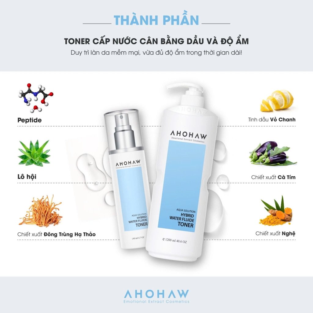 THÀNH PHẦN VÀ CÔNG DỤNG CỦA TONER CÂN BẰNG DA, CẤP ẨM AHOHAW HYBIRD WATER FLUIDE TONER