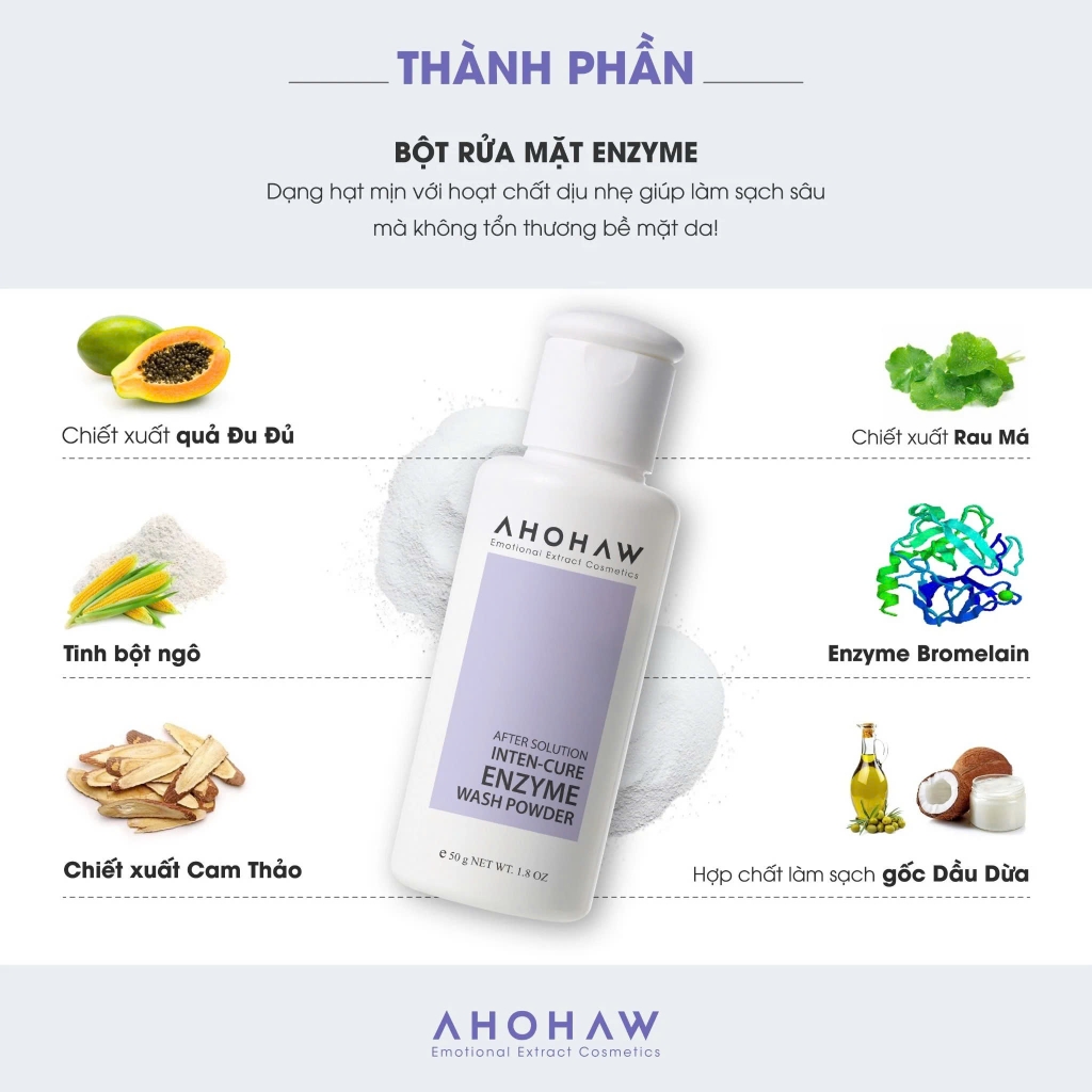 AHOHAW INTEN CURE ENZYME WASH POWDER chứa các thành phần tẩy tế bào chết và dưỡng da hiệu quả: