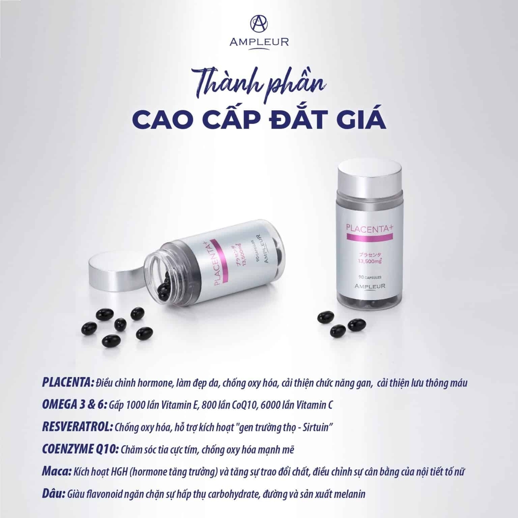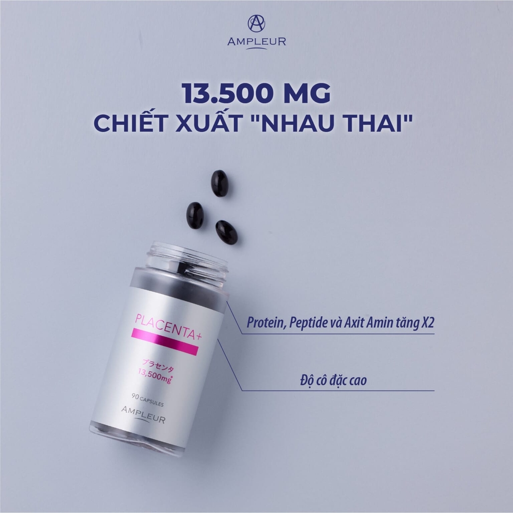 13.500mg tinh chất nhau thai heo cô đặc gấp 50 lần: Giàu axit amin, vitamin, khoáng chất và các yếu tố tăng trưởng, giúp nuôi dưỡng tế bào, chống lão hóa, làm đẹp da, cân bằng nội tiết tố.
