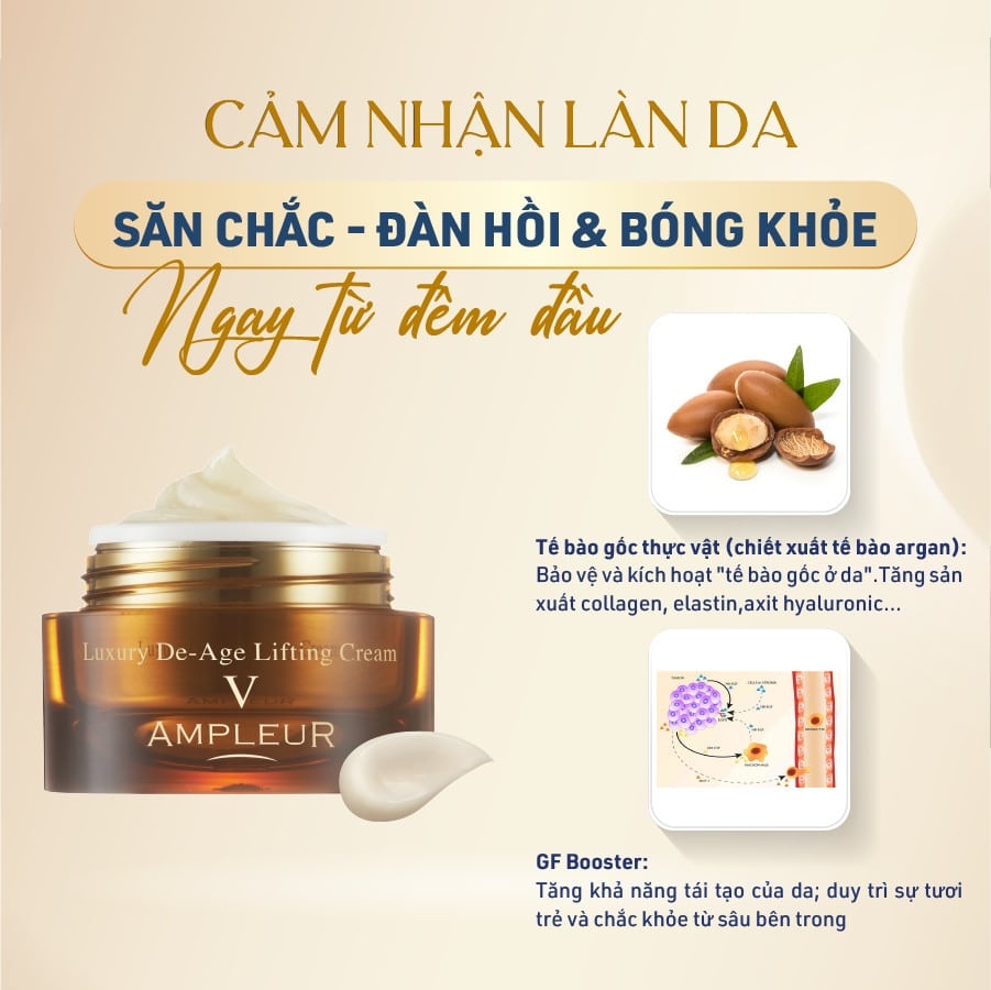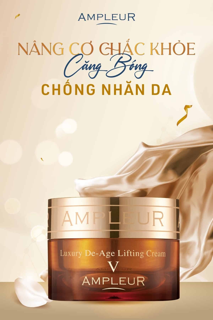 Làn da lão hoá, nếp nhăn, chảy xệ khiến bạn mất tự tin? AMPLEUR LUXURY DE-AGE LIFTING CREAM V - kem dưỡng nâng cơ, chống lão hoá đến từ Nhật Bản sẽ là giải pháp "vàng" dành cho bạn! Với công thức độc quyền kết hợp cùng các thành phần quý giá, sản phẩm mang đến hiệu quả trẻ hoá da vượt trội, giúp làn da săn chắc, đàn hồi, căng mịn và rạng rỡ.