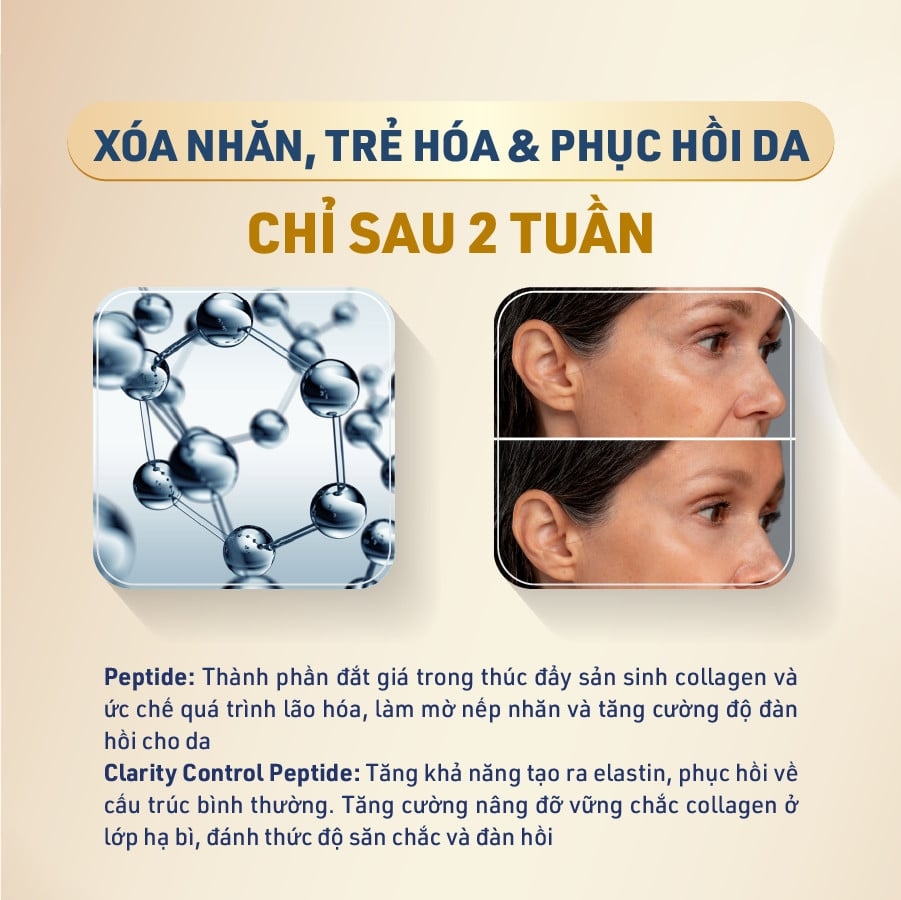 Clarity Control Peptide: Tăng khả năng tạo ra elastin, phục hồi về cấu trúc bình thường. Tăng cường nâng đỡ vững chắc collagen ở lớp hạ bì, đánh thức độ săn chắc và đàn hồi