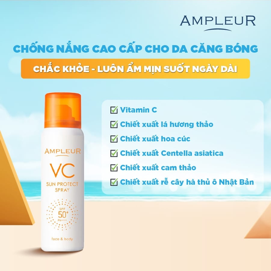 AMPLEUR VC SUN PROTECT SPRAY là kem chống nắng dạng xịt với chỉ số SPF50+/PA++++, giúp bảo vệ da toàn diện khỏi tác hại của tia UVA và UVB. Sản phẩm với công thức độc đáo, chứa Vitamin C và các thành phần dưỡng da từ thiên nhiên, mang đến hiệu quả chống nắng vượt trội, đồng thời dưỡng trắng, cấp ẩm, cho làn da khỏe mạnh, tươi trẻ.