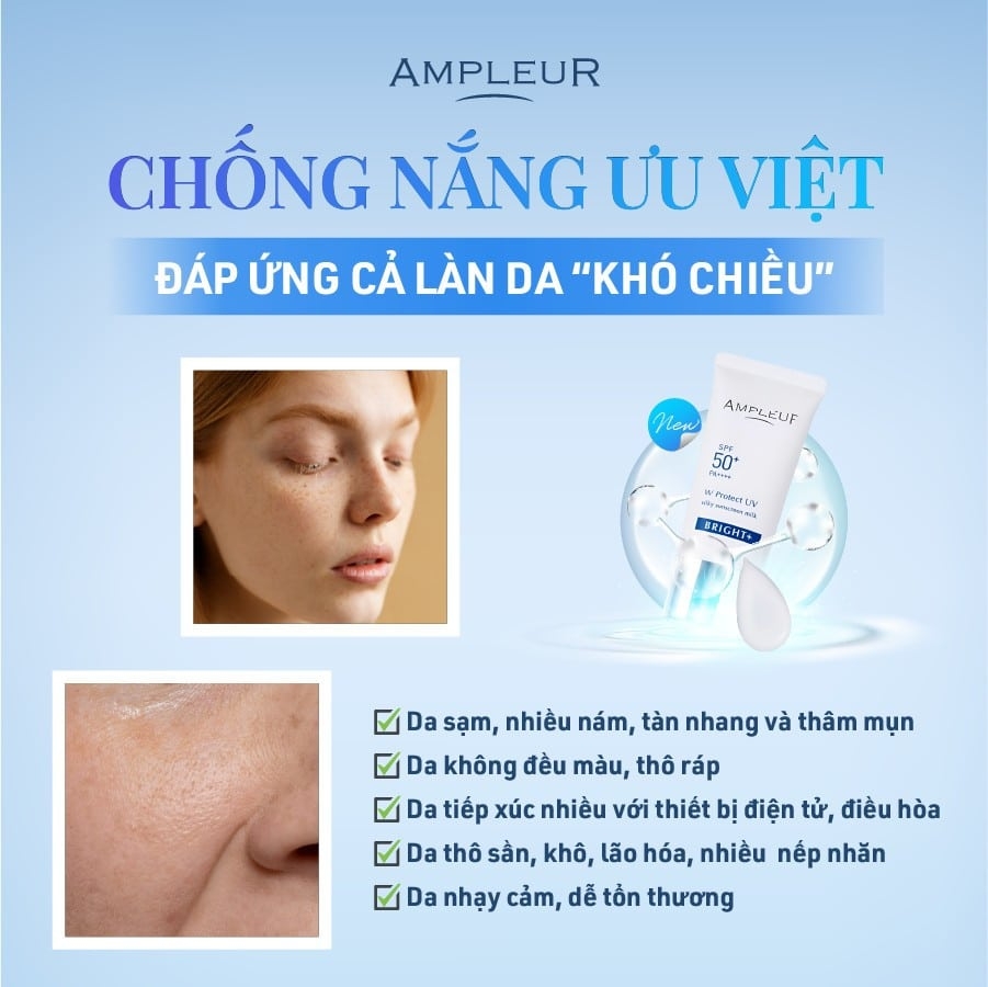 AMPLEUR W PROTECT UV BRIGHT+ là kem chống nắng vật lý lai hóa học, tích hợp nhiều công dụng vượt trội trong một sản phẩm. Không chỉ chống nắng hiệu quả, sản phẩm còn dưỡng trắng, cấp ẩm, chống oxy hóa, giúp cải thiện các vấn đề về sắc tố da, mang đến làn da khỏe mạnh, trắng sáng rạng ngời.
