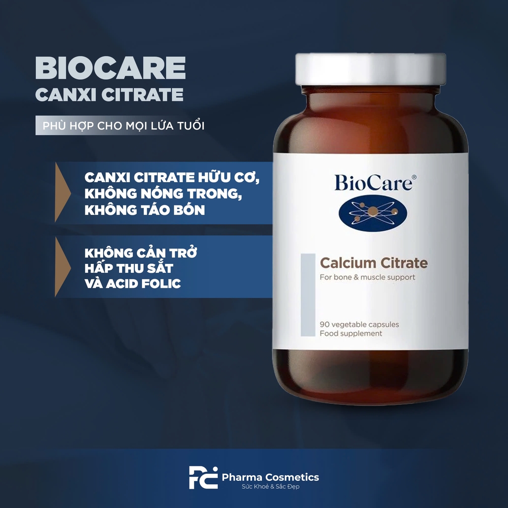 Biocare Calcium Citrate - viên uống bổ sung canxi hữu cơ đến từ thương hiệu Biocare (Anh Quốc) với công thức dễ hấp thu, giúp xương chắc khỏe, dẻo dai, phòng ngừa loãng xương hiệu quả. Sản phẩm được sản xuất theo tiêu chuẩn chất lượng nghiêm ngặt, an toàn và lành tính cho người sử dụng.