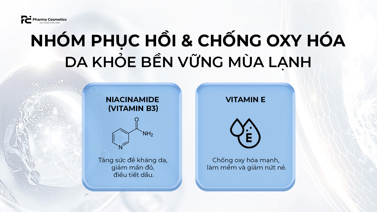Giá trị mùa khô: Khi hàng rào da bị suy yếu, Niacinamide giúp tăng cường khả năng giữ ẩm tự nhiên, đồng thời chống lại các tác nhân gây viêm nhiễm và kích ứng.