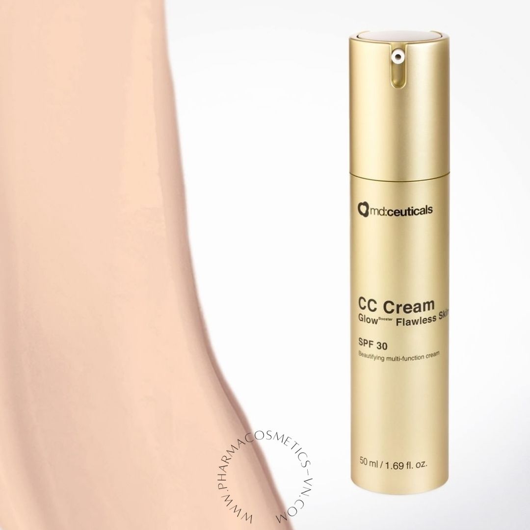 Md: ceuticals 'CC Cream GlowBooster Flawless Skin SPF 30 cung cấp độ che phủ hoàn hảo tức thì, đồng nhất tông màu da, che đi các khuyết điểm, dưỡng ẩm sâu và làm sáng vùng da xỉn màu, để lộ làn da hoàn hảo tự nhiên. Chỉ trong một bước duy nhất, loại kem đa chức năng này sẽ nuôi dưỡng, bảo vệ, sửa chữa các khuyết điểm và làm giảm các nếp nhăn, giúp tăng cường vẻ rạng rỡ cho làn da.