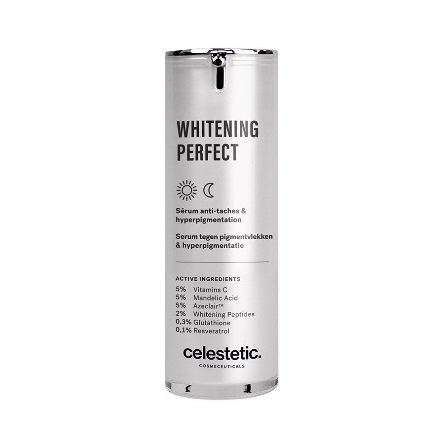 CELESTETIC WHITENING PERFECT là tinh chất cốt lõi trong liệu trình điều trị chuyên sâu các vấn đề về tăng sắc tố da như nám, sạm, tàn nhang, đồi mồi. Sản phẩm ứng dụng công thức mạnh mẽ với các hoạt chất làm trắng tiên tiến và công nghệ Liposome đột phá, giúp tinh chất thẩm thấu sâu vào đa tầng da, tác động trực tiếp vào nguyên nhân gốc rễ gây ra tình trạng thâm nám. Nhờ đó, CELESTETIC WHITENING PERFECT mang lại hiệu quả vượt trội trong việc xóa mờ các vết nám, sạm cứng đầu do tác động của ánh nắng mặt trời hay sự thay đổi nội tiết tố. Đặc biệt, sản phẩm còn có thể được ứng dụng để điều trị tập trung trên các vùng da bị tăng sắc tố nặng.