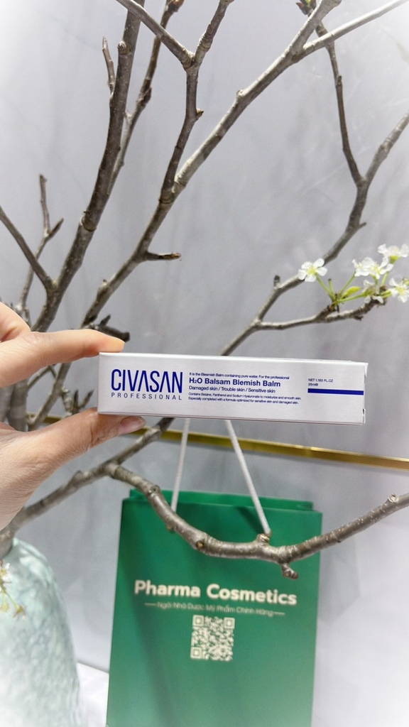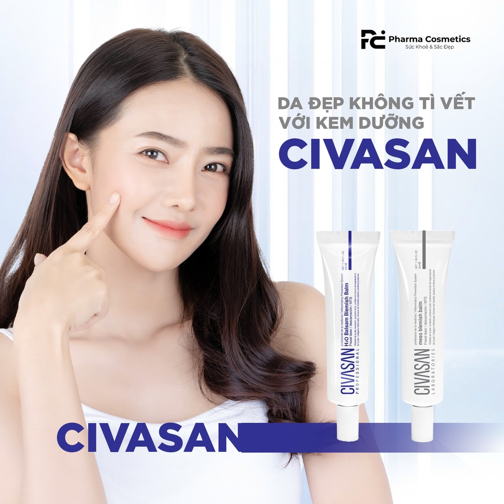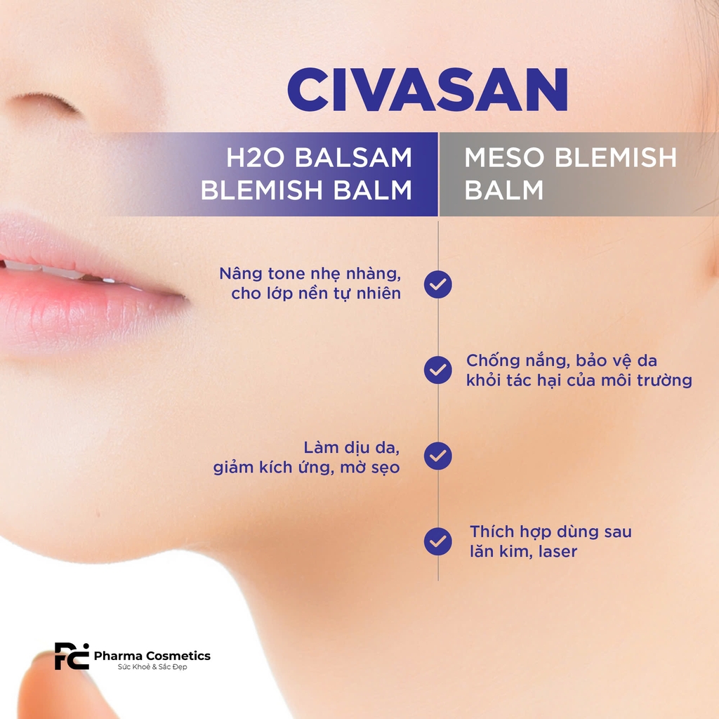 - Kem Dưỡng Civasan H2O Balsam Blemish Balm là dạng kem vừa có tác dụng dưỡng da vừa có màu nền như một lớp trang điểm chuyên nghiệp. Hơn nữa nhờ công thức chống nắng bảo vệ da và ngăn chặn tia tử ngoại và bụi bẩn có hại cho da. Nó bảo vệ và điều trị tổn thương cho da sau phẩu thuật bắn laser, da mỏng yếu. Ngoài ra, Civasan H2O Balsam Blemish Balm còn cung cấp dưỡng chất cho da, tăng cường độ ẩm, xóa mờ sẹo, phục hồi da tổn thương sau lăn kim hoặc laser.