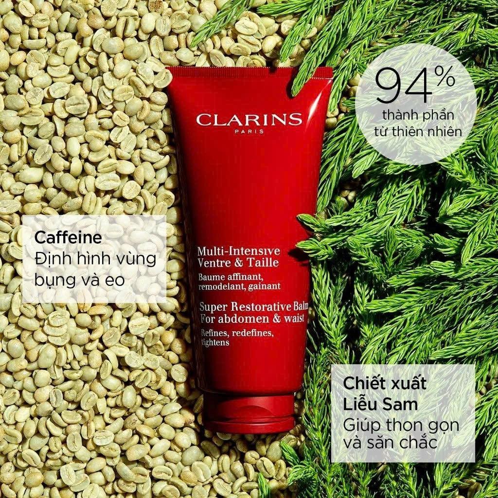 CLARINS SUPER RESTORATIVE BALM FOR ABDOMEN & WAIST là kem dưỡng thể chuyên sâu, được thiết kế để hỗ trợ cải thiện độ săn chắc và giúp định hình lại vùng bụng và eo, mang lại một vóc dáng trông gọn gàng hơn. Sản phẩm này đặc biệt phù hợp cho phụ nữ từ 50 tuổi trở lên, khi cơ thể có những thay đổi đáng kể. Công thức chứa 94% thành phần có nguồn gốc tự nhiên, với chiết xuất Cryptomeria hữu cơ – một hoạt chất tiên tiến từ cây Tuyết tùng Nhật Bản. Kem dưỡng này không chỉ cung cấp độ ẩm chuyên sâu, giúp da mềm mại và săn chắc mà còn hỗ trợ cải thiện tình trạng da chảy xệ, mang lại một vòng eo và bụng trông được định hình rõ nét hơn.