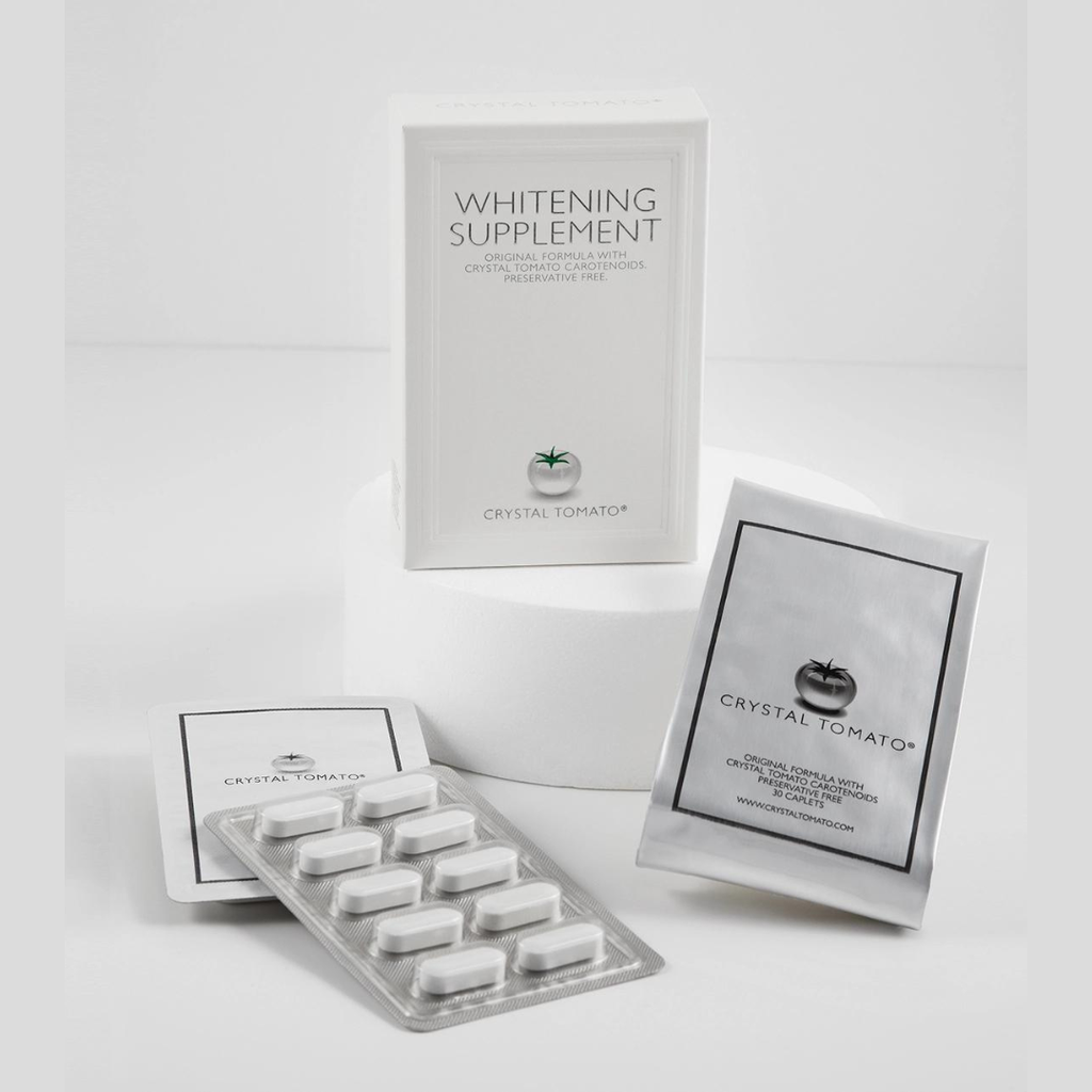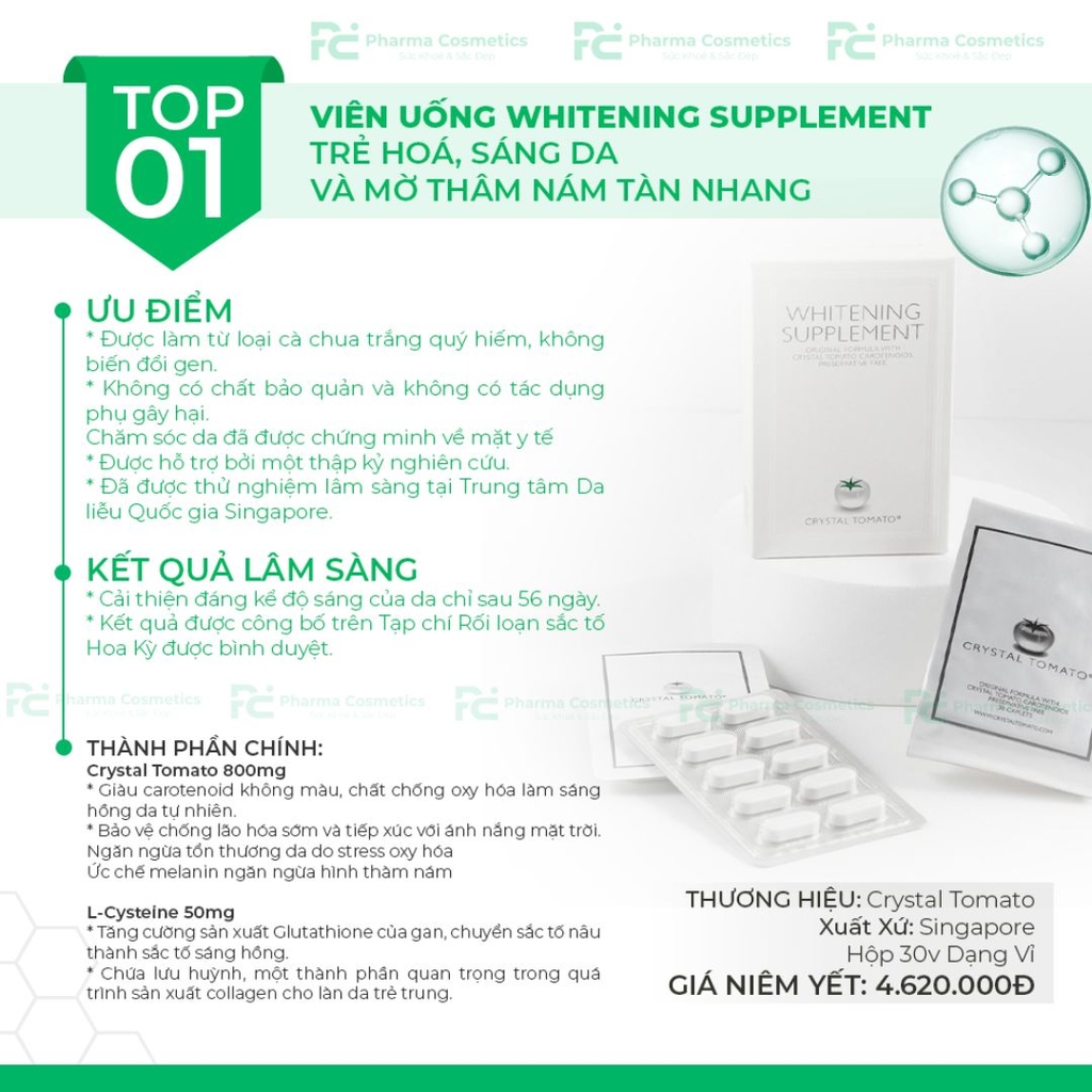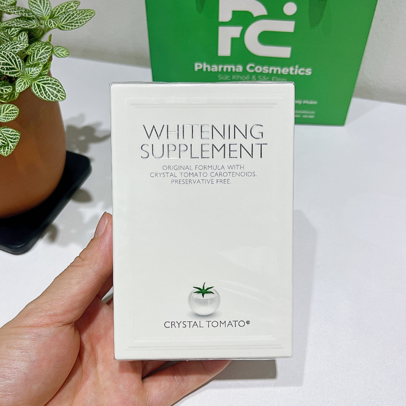 Viên uống trắng da Crystal Tomato Whitening Supplement được giới chuyên môn đánh giá là dòng sản phẩm hỗ trợ làm sáng da hiệu quả và độc đáo nhất hiện nay với thành phần chiết xuất từ giống cà chua trắng có khả năng tác động mạnh giúp ngăn cản quá trình tăng sinh sắc tố Melanin trong cơ thể từ đó hạn chế tình trạng da sạm màu, xuất hiện nhiều đốm nâu, tàn nhang, đồi mồi.