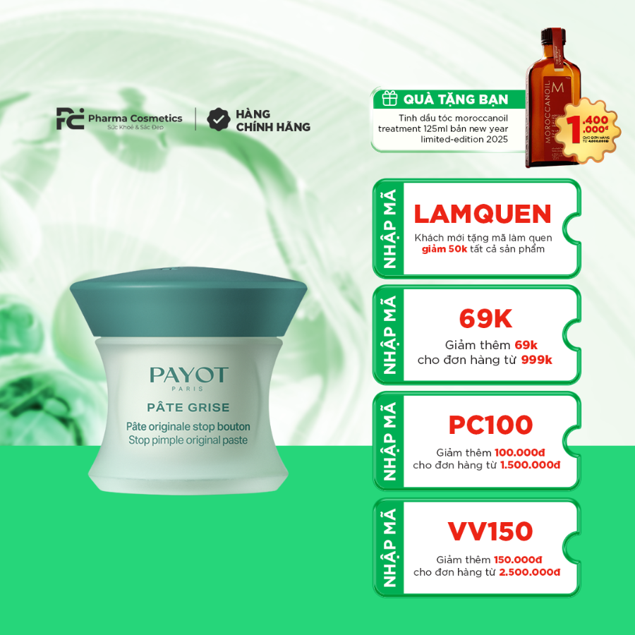 Payot Pâte Originale Stop Bouton là kem chấm mụn dạng paste ban đêm, một sản phẩm kinh điển được cải tiến từ công thức huyền thoại năm 1920 của Payot. Với phiên bản mới này, sản phẩm mang lại hiệu quả vượt trội, nguồn gốc thiên nhiên hơn và trải nghiệm sử dụng tinh tế hơn. Lấy cảm hứng từ những tiến bộ khoa học mới nhất về sự mất cân bằng hệ vi sinh vật trên da, công thức mới kết hợp các thành phần tiên tiến để hỗ trợ giảm mụn, làm dịu da và khôi phục sự cân bằng của hệ vi sinh vật.