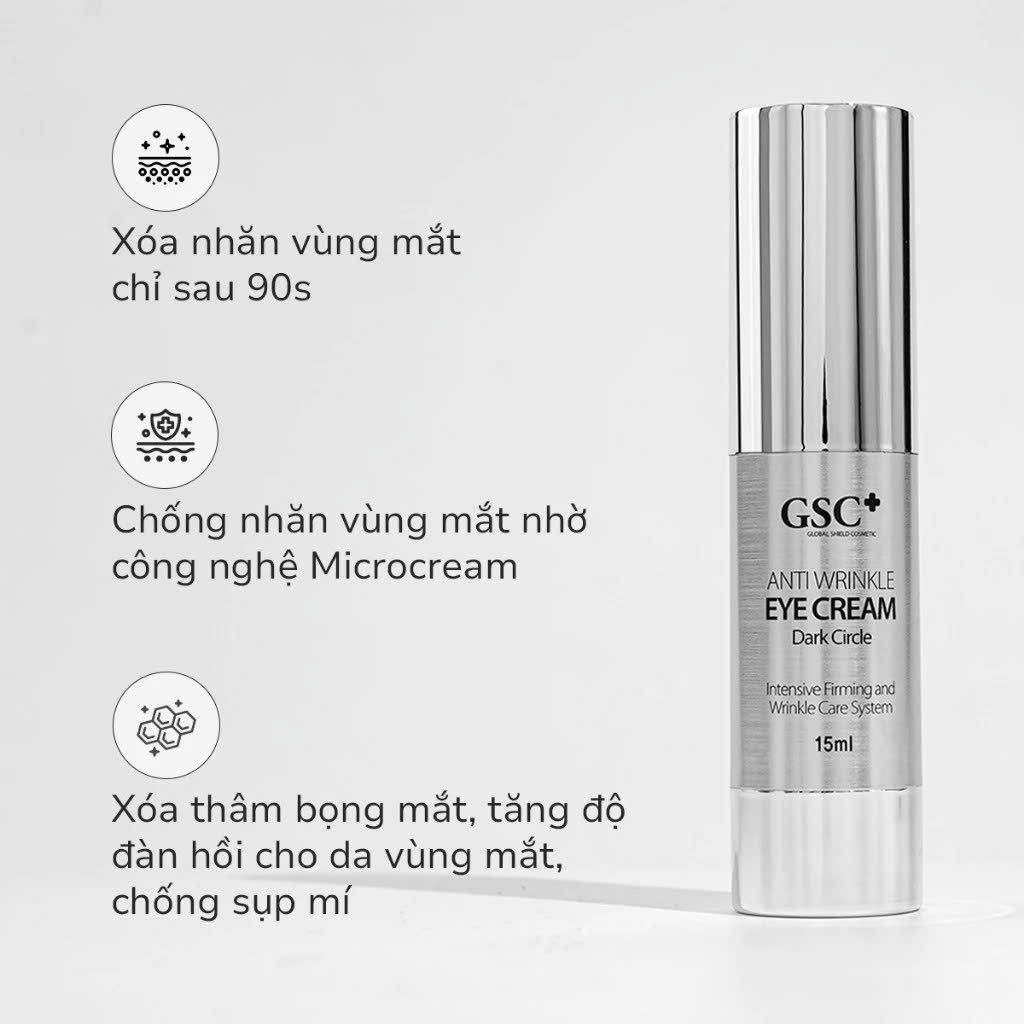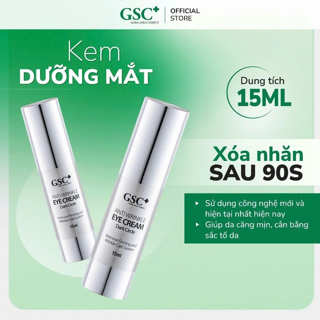 GSC Anti Wrinkle Eye Cream là kem dưỡng mắt chuyên sâu, được bào chế với công nghệ Micro Cream tiên tiến, giúp các hoạt chất có cấu trúc siêu vi, thẩm thấu sâu vào da, mang lại hiệu quả căng mịn tức thì. Sản phẩm giúp bổ sung độ ẩm cần thiết, cân bằng sắc tố, giảm thâm và nhăn vùng mắt hiệu quả. Với sự kết hợp của các chiết xuất thực vật quý giá, kem dưỡng mắt GSC không chỉ làm đầy các rãnh nhăn, săn chắc vùng da quanh mắt mà còn bảo vệ da khỏi tác hại của môi trường và các gốc tự do, mang lại làn da tươi trẻ, rạng rỡ.