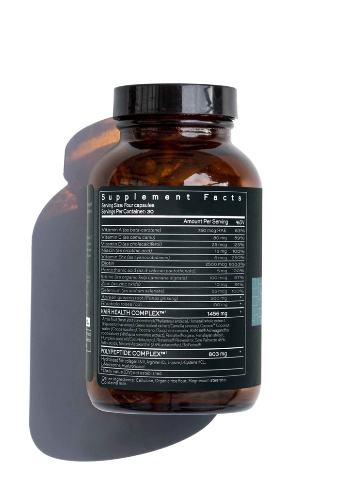 Tất cả thành phần: Vitamin A (dưới dạng beta-carotene) 750 mcg RAE, Vitamin C (dưới dạng camu camu) 80 mg, Vitamin D (dưới dạng cholecalciferol) 25 mcg, Niacin (dưới dạng nicotinic acid) 16 mg, Vitamin B12 (dưới dạng cyanocobalamin) 6 mcg, Biotin 2500 mcg, Pantothenic acid (dưới dạng d-canxi pantothenate) 5 mg, lodine (dưới dạng tảo bẹ hữu cơ Laminaria digitata) 100 mcg, Kẽm (dưới dạng kẽm oxit) 10 mg, Selen (dưới dạng natri selenate) 55 mcg, Rễ nhân sâm Hàn Quốc (Panax ginseng) 500 mg, Rễ Rhodiola rosea 100 mg, Phức hợp chắc khỏe tóc 1456 mg bao gồm