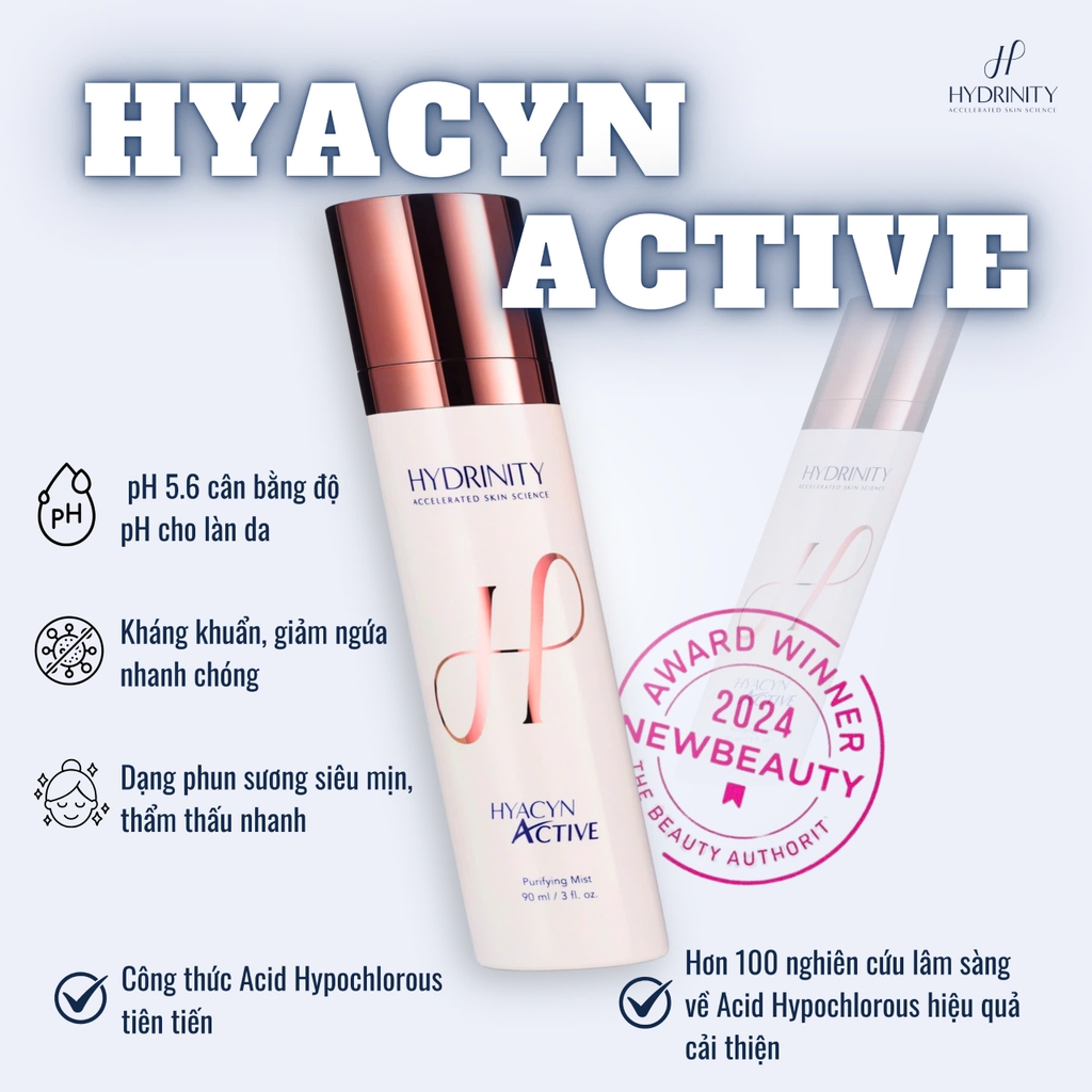 HYDRINITY HYACYN ACTIVE MIST là xịt khoáng phục hồi da y khoa tiên tiến, ứng dụng công nghệ Hypochlorous Acid (HOCl) tinh khiết ở nồng độ tối ưu. Sản phẩm mang đến giải pháp làm dịu nhanh chóng các tình trạng kích ứng, đỏ rát thường gặp sau các liệu trình thẩm mỹ chuyên sâu như laser, microneedling, peel da. Bên cạnh đó, Hyacyn Active Mist còn có khả năng kháng khuẩn nhẹ nhàng, hỗ trợ làm sạch da mà không gây khô căng, đồng thời thúc đẩy quá trình phục hồi và tái tạo mô da khỏe mạnh. Công thức dịu nhẹ, an toàn cho cả làn da nhạy cảm nhất.