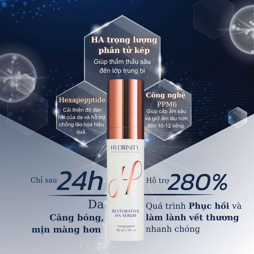 HYDRINITY RESTORATIVE HA SERUM là tinh chất phục hồi da chuyên sâu, được thiết kế đặc biệt cho làn da sau các liệu trình thẩm mỹ như laser, peel, vi kim hoặc da đang bị tổn thương, nhạy cảm. Với công nghệ đột phá Supercharged Hyaluronic Acid thế hệ mới, serum giúp cấp ẩm mạnh mẽ và duy trì độ ẩm tối ưu trên da. Đặc biệt, công nghệ độc quyền được cấp bằng sáng chế PPM6™ hỗ trợ giảm viêm, phục hồi hàng rào bảo vệ da và kích thích quá trình tái tạo tự nhiên. Phức hợp peptide và các chất chống oxy hóa mạnh mẽ giúp trung hòa gốc tự do, tăng cường độ đàn hồi và cải thiện kết cấu da, mang lại làn da khỏe mạnh và tươi trẻ.