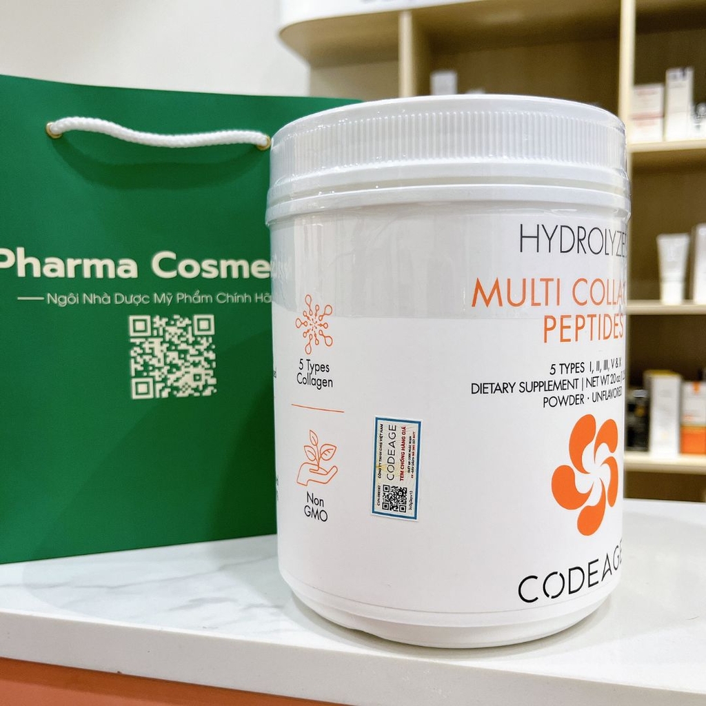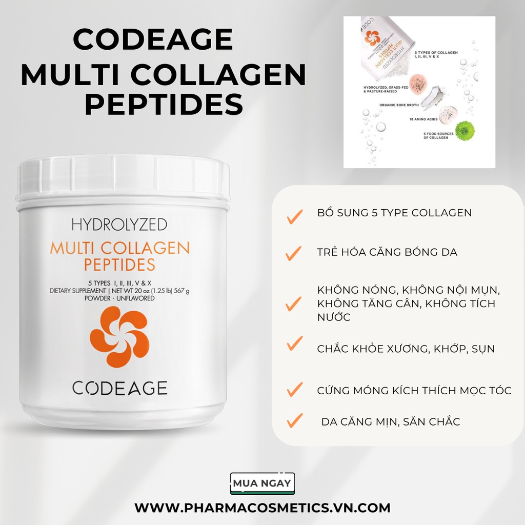 \nCODEAGE HYDROLYZED MULTI COLLAGEN PEPTIDES cung cấp 9000mg Collagen thủy phân và peptide, 50mg Sodium mỗi muỗng.