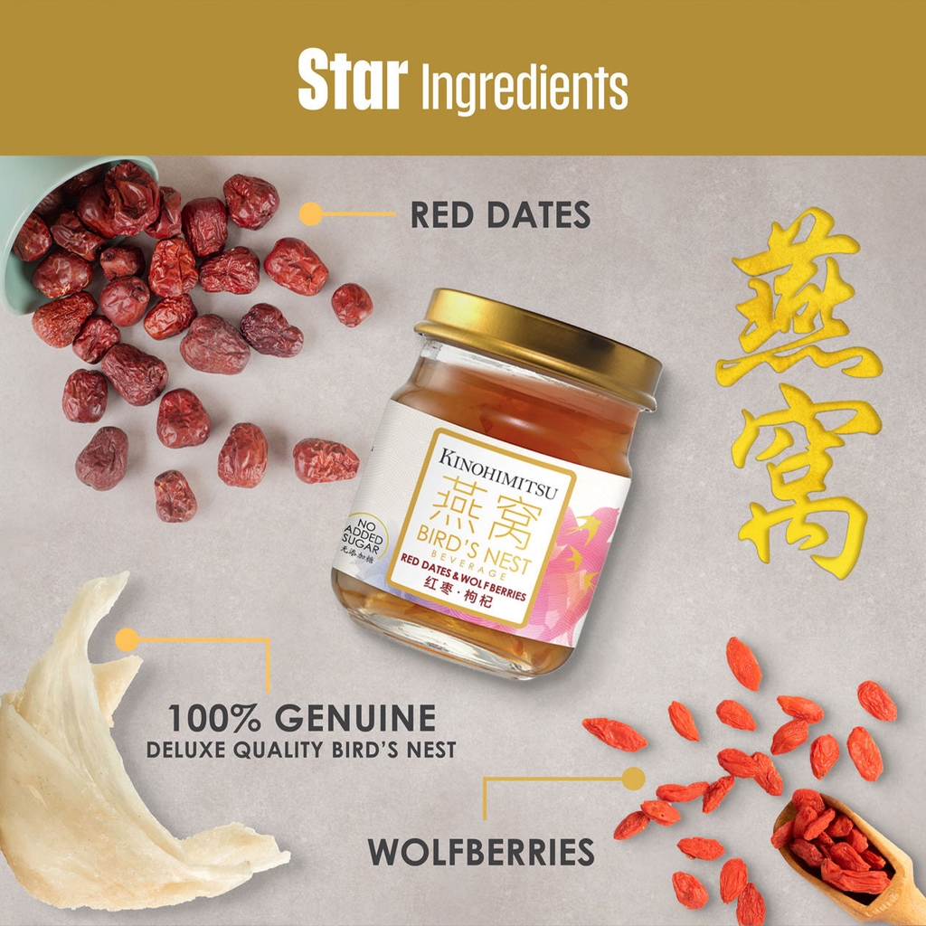 THÀNH PHẦN VÀ CÔNG DỤNG CỦA NƯỚC YẾN THƯỢNG HẠNG ĐẸP DA, TRƯỜNG THỌ KINOHIMITSU BIRD’S NEST WITH RED DATES & WOLFBERRIRS 75G