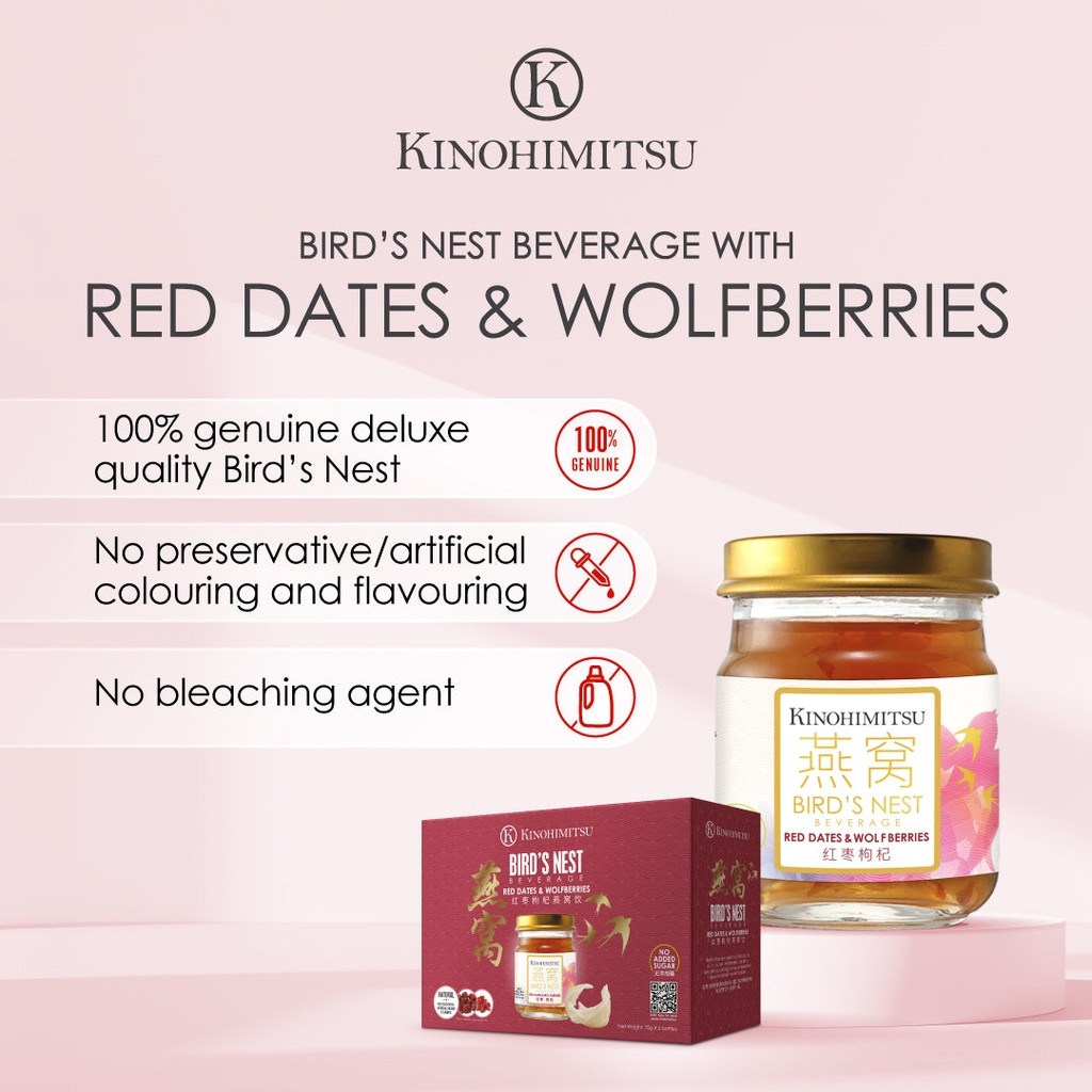 KINOHIMITSU BIRD’S NEST WITH RED DATES & WOLFBERRIRS 75G / NƯỚC YẾN THƯỢNG HẠNG ĐẸP DA, TRƯỜNG THỌ