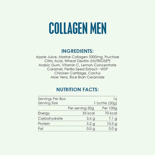 Thành phần chi tiết: Nước ép táo, Collagen (cá) 5.300 mg, Fructose, Axit xitric, Dextrin lúa mì (NUTRIOSE®), Kẹo cao su Ả Rập, Vitamin C, Cô đặc chanh, Caramel, Chiết xuất hạt tía tô - WSP, Sụn gà, Xương rồng, Lô hội, Ceramide cám gạo