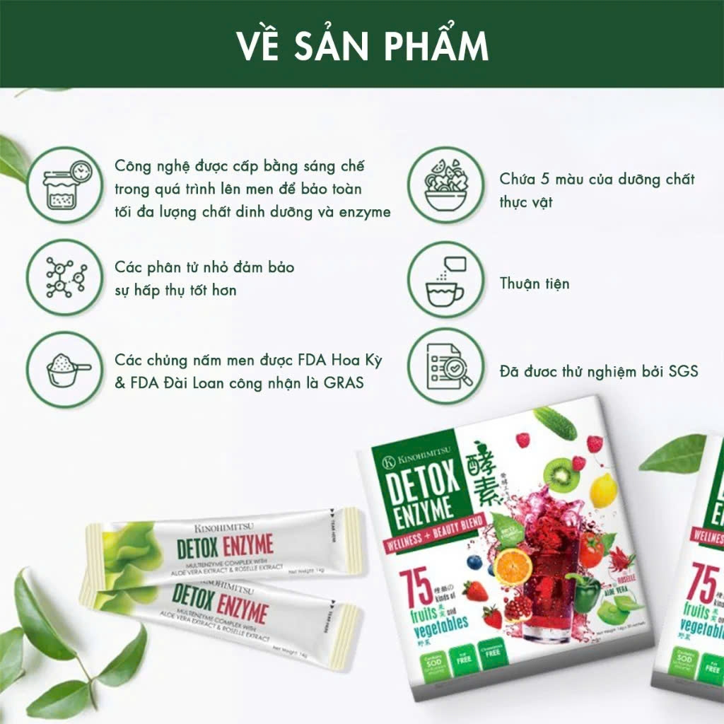 KINOHIMITSU DETOX ENZYME là sản phẩm dạng bột uống, chứa phức hợp enzyme từ 75 loại rau củ quả lên men tự nhiên, kết hợp cùng các thành phần hỗ trợ tiêu hóa, giúp thanh lọc cơ thể, đào thải độc tố, cải thiện sức khỏe hệ tiêu hóa và làn da.