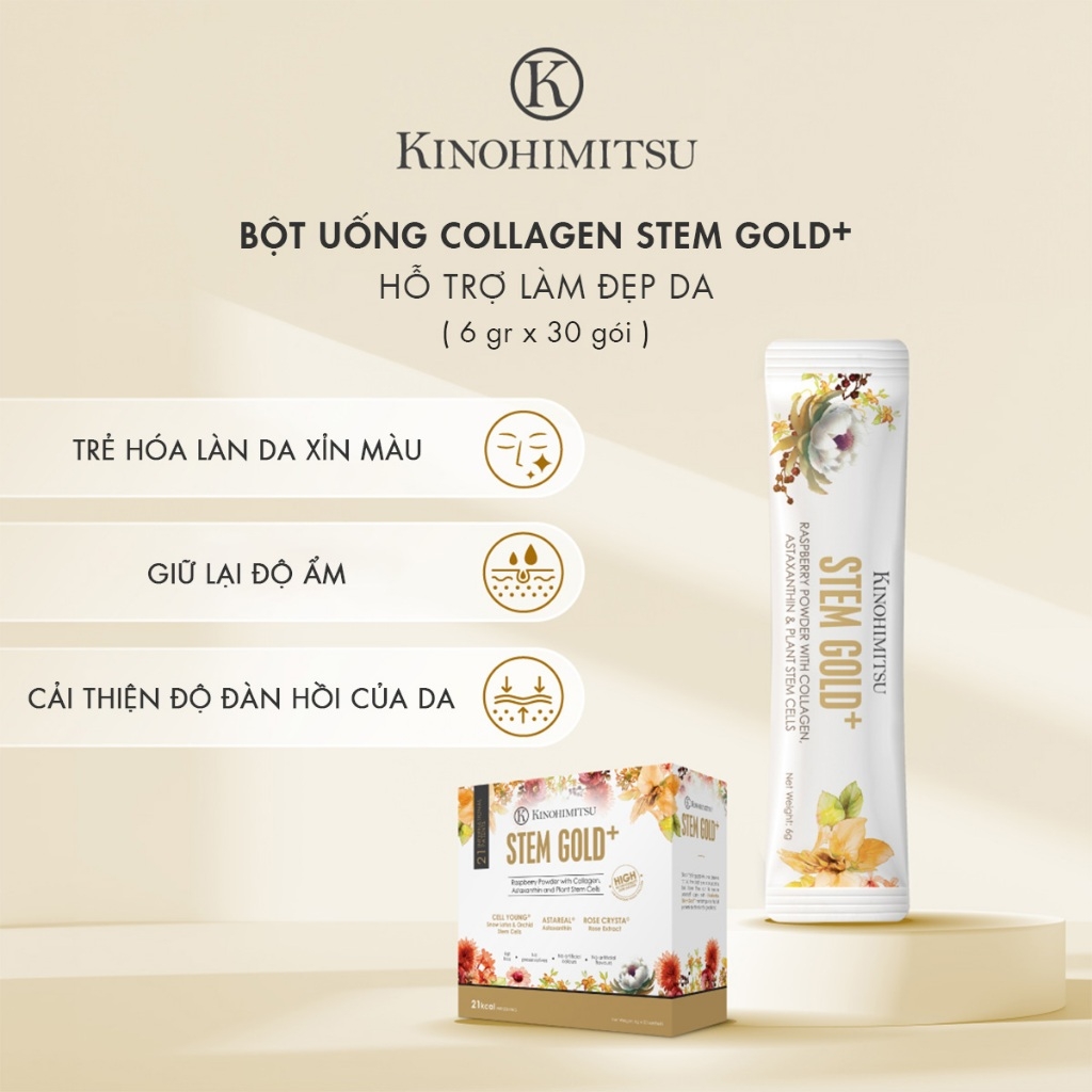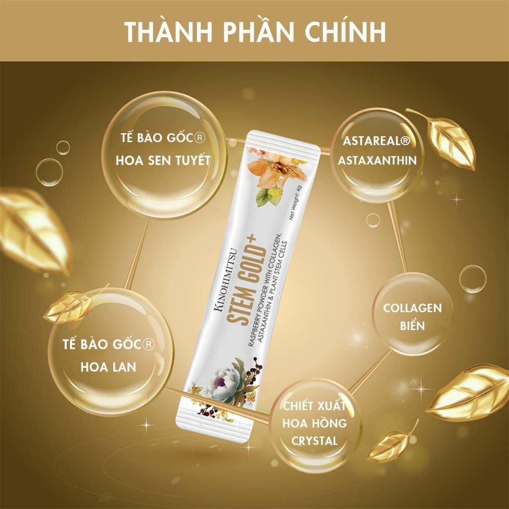 THÀNH PHẦN VÀ CÔNG DỤNG CỦA BỘT UỐNG COLLAGEN CAO CẤP TĂNG SỰ ĐÀN HỒI, ẨM MỊN VÀ ĐỀU MÀU DA KINOHIMITSU STEM GOLD 6G