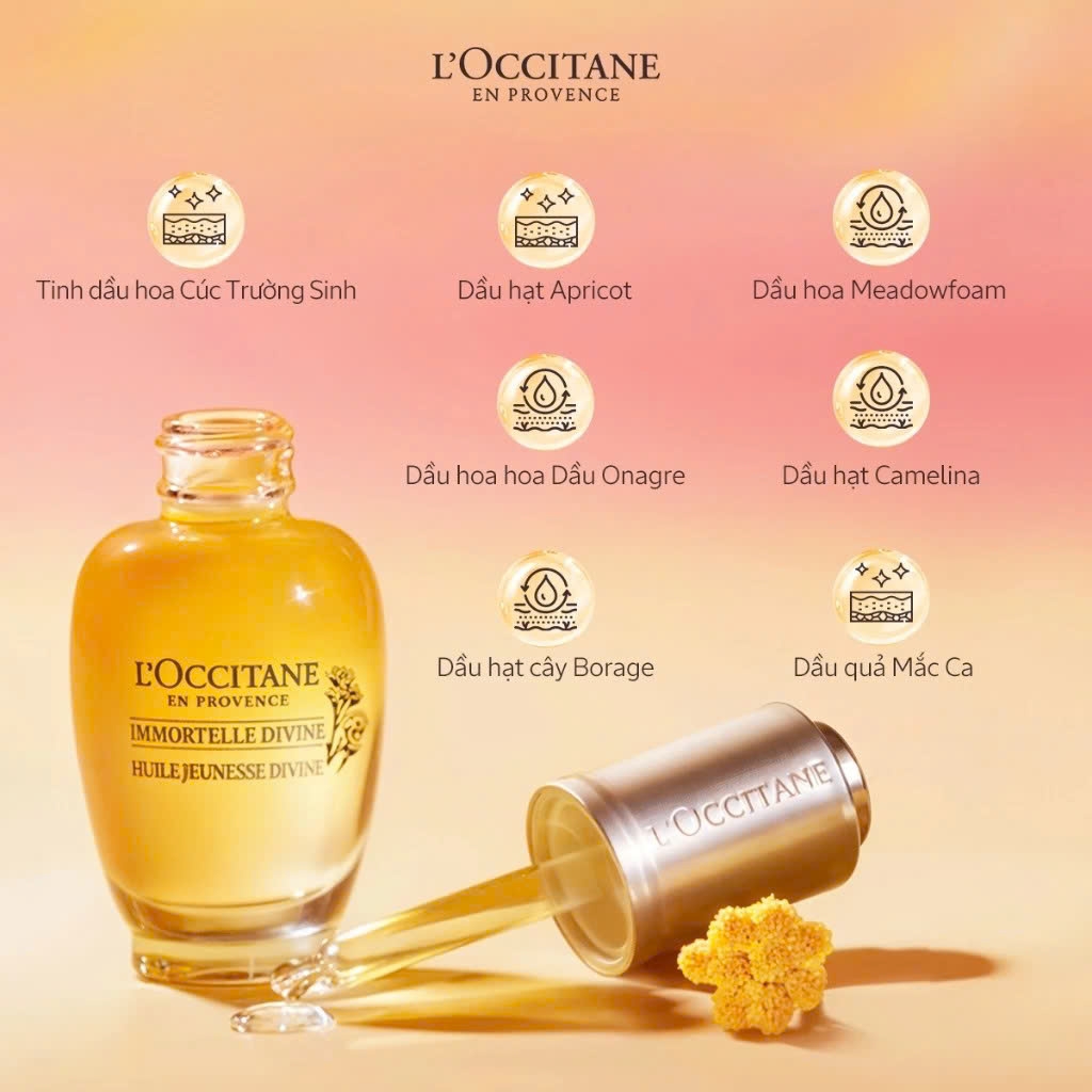 L'OCCITANE IMMORTELLE DIVINE YOUTH OIL là \"dầu dưỡng đa năng\" được lấy cảm hứng từ loài Cúc Trường Sinh - một \"loài hoa bất tử\" với sức sống mãnh liệt. Sản phẩm này là sự kết hợp của 100% tinh dầu Cúc Trường Sinh hữu cơ, siêu chiết xuất Cúc Trường Sinh và phức hợp 7 thành phần tự nhiên, giúp đẩy lùi các dấu hiệu lão hóa sớm, nuôi dưỡng và phục hồi làn da căng bóng, sáng mịn. Với kết cấu mỏng nhẹ, dầu dưỡng thẩm thấu nhanh chóng vào da mà không gây bết dính, mang lại cảm giác mềm mịn và êm dịu. Sử dụng sản phẩm hàng ngày, làn da sẽ được cung cấp dưỡng chất, bổ sung độ ẩm và phục hồi vẻ sáng bóng, giúp làm mờ nếp nhăn và mang lại làn da rạng rỡ, đều màu.
