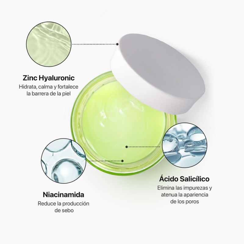 Kẽm: Kháng khuẩn, giảm viêm, hỗ trợ điều trị mụn. Thành phần chi tiết: Aqua (Nước), Propanediol, Natri Polyacryloyldimethyl Taurate, 1,2-Hexanediol, Silica, Niacinamide, Chiết xuất Chlorella Vulgaris, Dầu trái cây Olea Europaea (Ô liu), Carnosine, Dầu hạt Carthamus Tinctorius (Safflower), Chiết xuất Fomes Officinalis (Nấm), Chiết xuất Laminaria Digitata, Kẽm Hyaluronate thủy phân, Allantoin, Axit Lactic, Dimethicone, Isostearamidopropyl Ethyldimonium Ethosulfate, Glycerin, Tocopherol, Butylene Glycol, Propylene Glycol, PEG-8, Natri Gluconate, Keo Senegal Gum, Xanthan Gum, Axit Salicylic, Natri Hydroxide, PEG -240/HDI Copolymer BIS-Decyltetradeceth-20 Ether, Kali Laurate, Hydroxyacetophenone, CI 19140 (Fd&C Yellow No.5), Parfum (Hương thơm), CI 42090 (Fd&C Blue No.1).