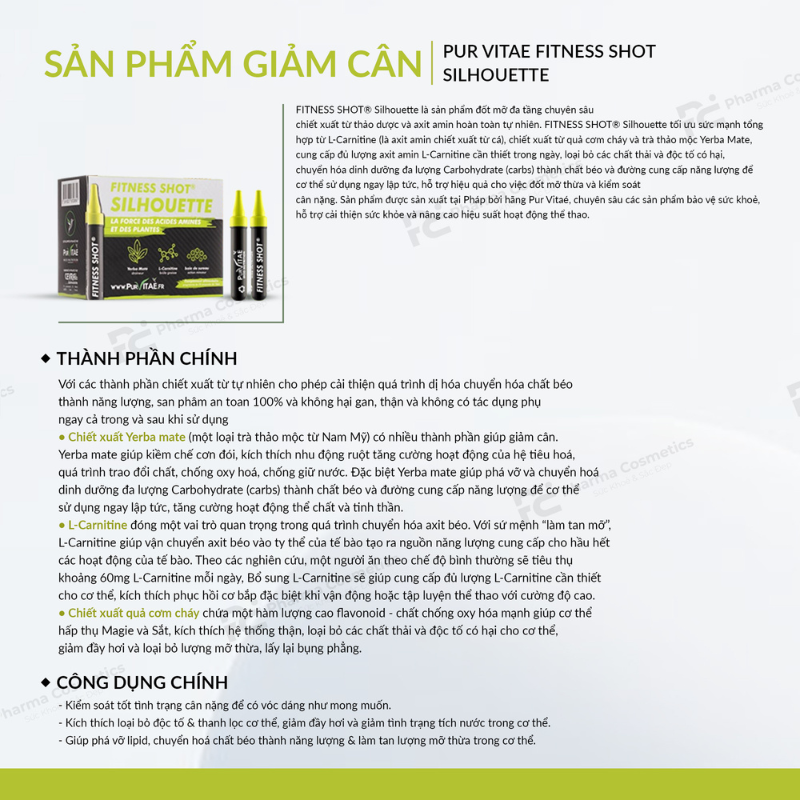 Chi tiết sản phẩm: https://pharmacosmetics-vn.com/pur-vitae-fitness-shot-silhouette-nuoc-uong-ho-tro-dot-mo-da-tang-chuyen-sau