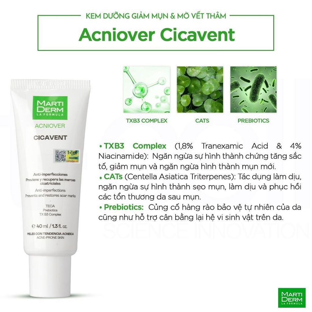MARTIDERM ACNIOVER CICAVENT là kem dưỡng chuyên biệt dành cho da hỗn hợp đến da dầu, giúp điều tiết bã nhờn, giảm mụn, kháng viêm và ngăn ngừa các tổn thương sau mụn như thâm, sẹo. Sản phẩm sở hữu phức hợp TXB3 Complex với 1.8% Tranexamic Acid và 4% Niacinamide có khả năng kháng khuẩn, kháng viêm mạnh mẽ. Công thức còn được bổ sung Centella Asiatica Triterpenes (CATs) và Prebiotics, giúp làm dịu, phục hồi, se khít lỗ chân lông, đồng thời củng cố hàng rào bảo vệ tự nhiên của da. Với kết cấu mỏng nhẹ, sản phẩm thẩm thấu nhanh và không để lại cảm giác nhờn dính.
