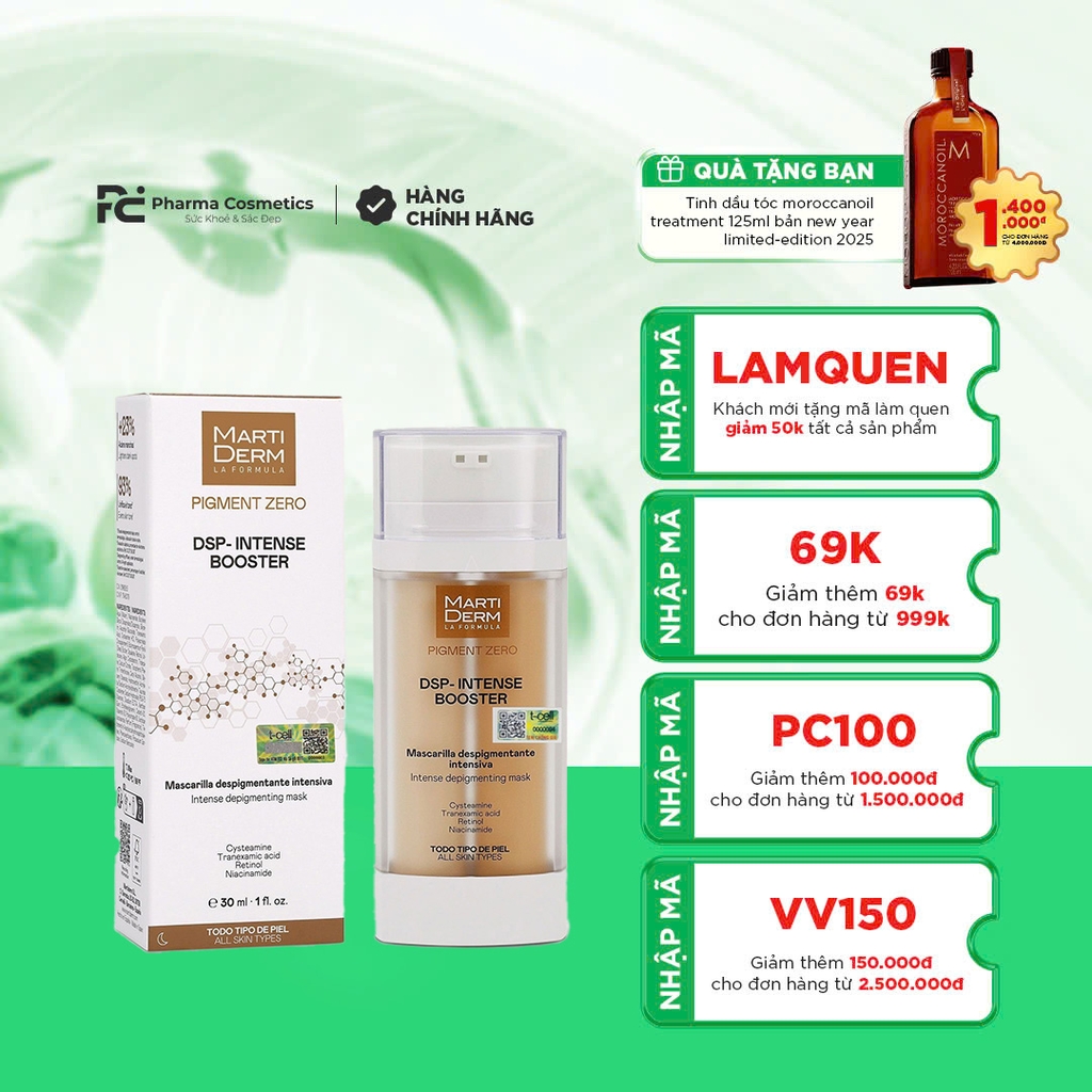 MARTIDERM DSP-INTENSE BOOSTER là mặt nạ điều trị tăng sắc tố da chuyên sâu, được thiết kế đặc biệt để giải quyết các vấn đề như nám, tàn nhang, đốm nâu và da không đều màu. Với công thức đột phá, sản phẩm sử dụng Cysteamine – một hoạt chất làm sáng da thế hệ mới, kết hợp cùng Retinol giúp thúc đẩy tái tạo tế bào, cải thiện rõ rệt các dấu hiệu lão hóa sớm. Sản phẩm còn chứa Axit Tranexamic và Niacinamide để hỗ trợ làm mờ thâm nám, điều tiết bã nhờn và củng cố hàng rào bảo vệ da. Thiết kế hai ngăn tách biệt giúp bảo toàn tối đa độ ổn định và hiệu quả của các hoạt chất, mang lại làn da mịn màng, tươi mới và đều màu.