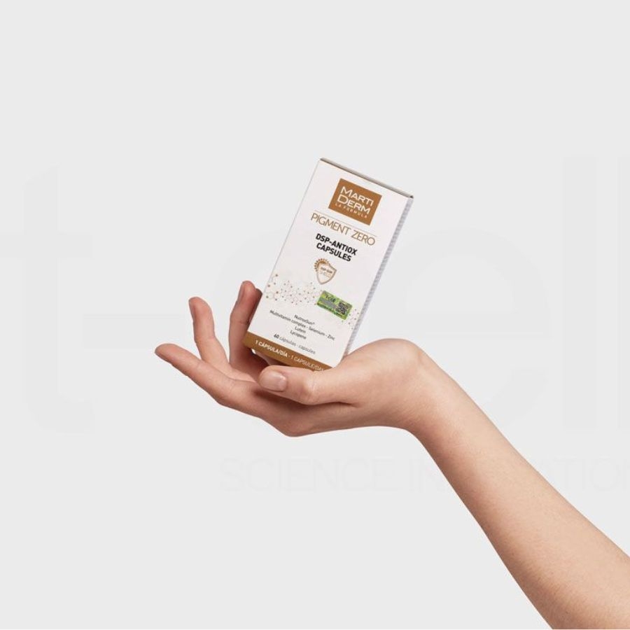 • MartiDerm Pigment Zero DSP Antiox Capsules công thức hoàn toàn thuần chay phù hợp với mọi chế độ sinh hoạt. Đây là thực phẩm chức năng bổ sung dạng viên uống giúp cải thiện khả năng phòng vệ tự nhiên của làn da trước tia tử ngoại, nhờ đó giảm thiểu sự phá hủy DNA và Collagen trong màng tế bào, đồng thời tăng cường hoạt động tái cấu trúc da, cung cấp Protein và Lipid cho quá trình nuôi dưỡng và bảo vệ da trở nên tốt hơn.