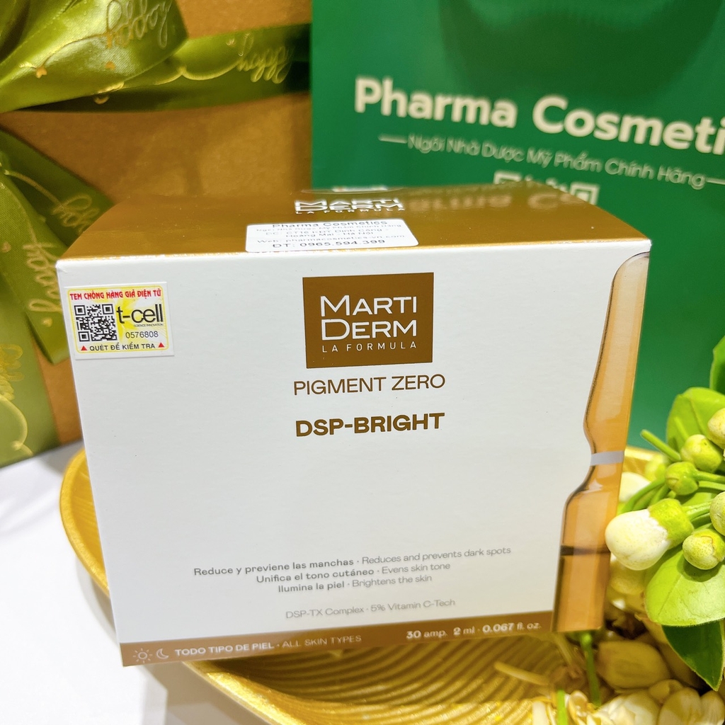 MartiDerm Pigment Zero DSP-Bright là ampoule làm sáng da và điều trị đốm sắc tố mạnh mẽ đến từ thương hiệu MartiDerm, được thiết kế dành cho tình trạng tăng sắc tố và da không đều màu. Công thức chứa 6 thành phần điều trị đốm sắc tố khác nhau được phối trộn và cô đặc trong 1 loại ampoule duy nhất để mang lại hiệu quả tối đa, giúp loại bỏ đốm sắc tố, đồng thời ngăn ngừa sản sinh và tích tụ melanin trong da, từ đó làm giảm kích thước và mật độ của các đốm nâu, dưỡng da sáng mịn đều màu.