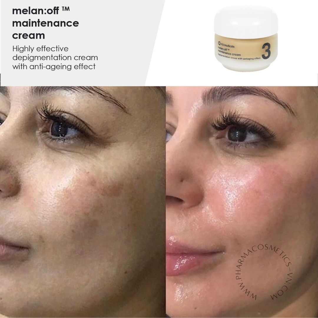 Kem dưỡng Melan: Off Maintenance Cream hiệu quả làm trắng da, xóa mờ các vết nám có nguồn gốc melan ở mặt, đường viền cổ, cổ, tay và cánh tay một cách nhanh chóng, an toàn và hiệu quả, sử dụng kết hợp các nguyên tắc hoạt động làm trắng khác nhau giúp ức chế quá trình hình thành sắc tố melanin trong tất cả các giai đoạn. Melan: Off Maintenance Cream được điều chỉnh để phù hợp với tất cả các loại da.