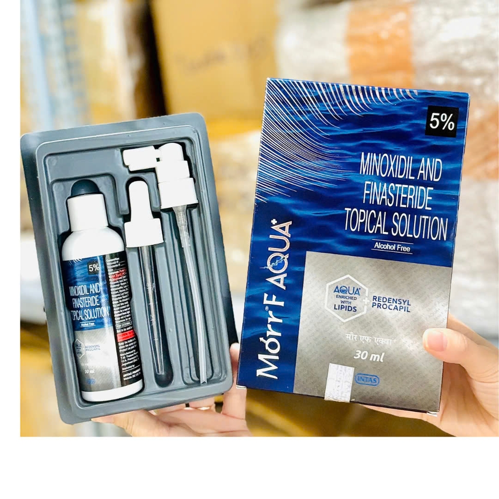 MORR F AQUA PLUS 5% TOPICAL SOLUTION là dung dịch trị rụng tóc và kích thích mọc tóc đến từ Ấn Độ, được nghiên cứu và phát triển bởi các chuyên gia da liễu. Với công thức độc đáo kết hợp 2 thành phần hoạt tính Minoxidil và Finasteride, sản phẩm mang đến giải pháp kép tác động trực tiếp vào nguyên nhân gây rụng tóc, giúp ngăn ngừa rụng tóc hiệu quả, kích thích mọc tóc, mang lại mái tóc dày dặn và chắc khỏe hơn.