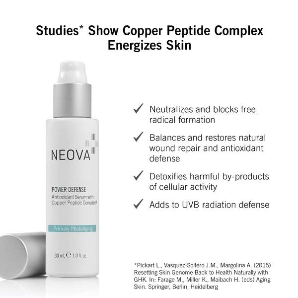 NEOVA POWER DEFENSE là tinh chất chống oxy hóa vượt trội, đến từ thương hiệu dược mỹ phẩm hàng đầu Hoa Kỳ - NEOVA. Sản phẩm chứa đựng công thức độc quyền Copper Peptide Complex® cùng các hoạt chất chống oxy hóa mạnh mẽ, giúp bảo vệ da khỏi tác hại của gốc tự do, kích thích sản sinh collagen, mang lại làn da săn chắc, mịn màng và tươi trẻ.