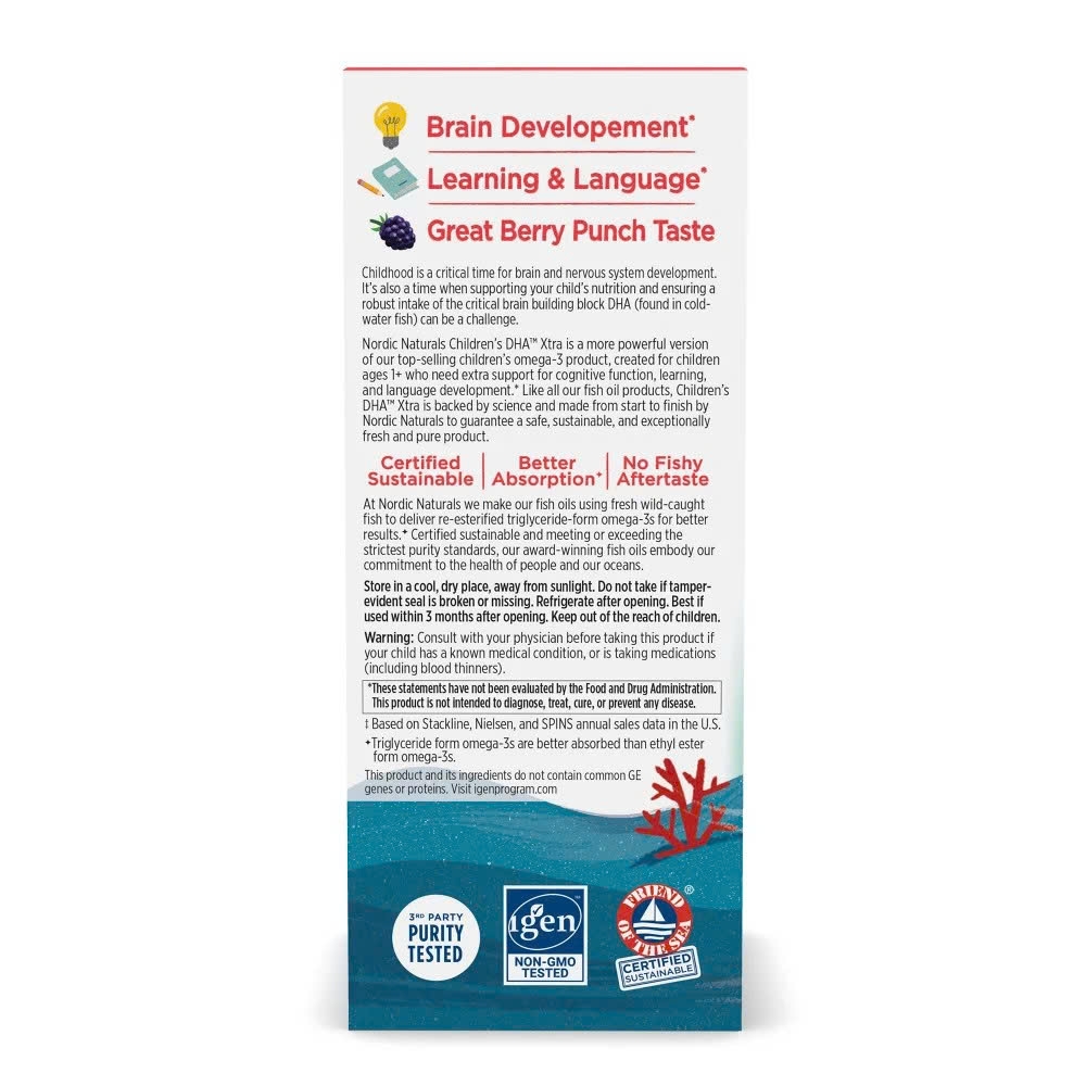Nordic Children's DHA Xtra là dòng sản phẩm bổ sung Omega-3 đậm đặc thế hệ mới từ thương hiệu Nordic Naturals hàng đầu thế giới. Với hàm lượng DHA gấp 3 lần so với phiên bản gốc, sản phẩm là giải pháp tối ưu để hỗ trợ sự phát triển trí não, chức năng nhận thức và thị lực vượt trội cho trẻ trong giai đoạn vàng từ 1 đến 6 tuổi