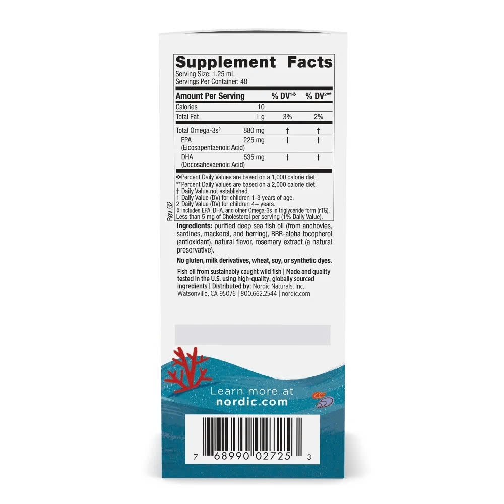 Thành Phần Chi Tiết: Dầu cá biển sâu tinh khiết (từ cá cơm, cá mòi, cá thu và cá trích), RRR-alpha tocopherol (chất chống oxy hóa), hương liệu tự nhiên, chiết xuất hương thảo (chất bảo quản tự nhiên).