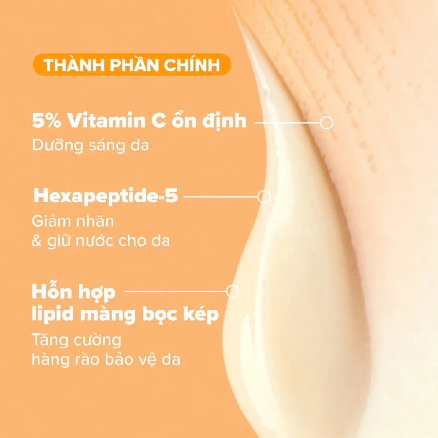 Làm Sáng Da Toàn Diện với 5% Vitamin C Ổn Định: Sự kết hợp của 3-O Ethyl Ascorbic Acid và Ascorbyl Glucoside giúp làm sáng và đều màu da hiệu quả, giảm thiểu các đốm sắc tố mà vẫn đảm bảo ổn định và ít gây kích ứng.