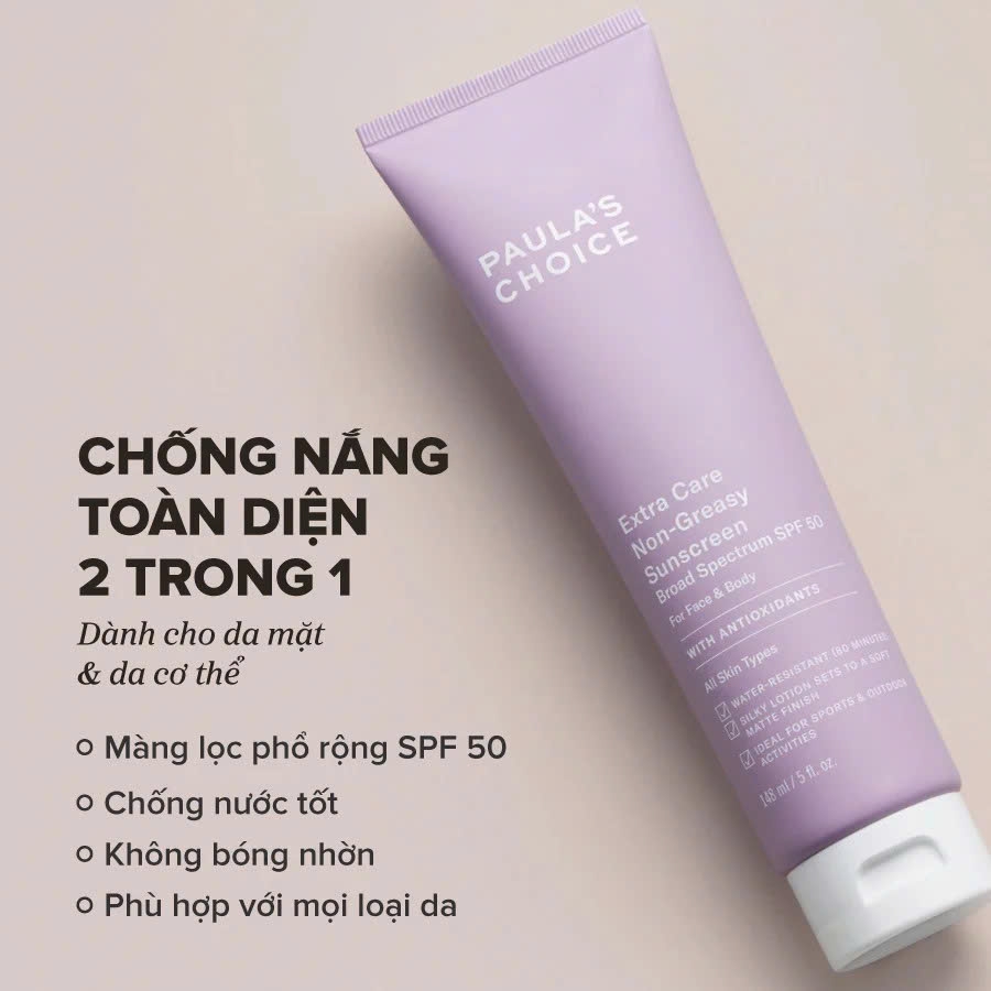 PAULA'S CHOICE EXTRA CARE NON-GREASY SUNSCREEN BROAD SPECTRUM SPF 50 là kem chống nắng toàn thân không gây bóng nhờn, được bào chế với công thức chống nắng phổ rộng mạnh mẽ, chỉ số SPF 50. Sản phẩm có kết cấu dạng kem sữa cực kỳ mỏng nhẹ, dễ dàng thẩm thấu và mang lại cảm giác ẩm mịn, dễ chịu trên da. Với công thức lâu trôi và khả năng chống nước, kem chống nắng này là lựa chọn lý tưởng cho các hoạt động ngoài trời, thể thao, hay đi biển. Đặc biệt, sản phẩm còn được làm giàu với các chất chống oxy hóa và chiết xuất lô hội, giúp bảo vệ da toàn diện, duy trì độ ẩm và làm dịu da.