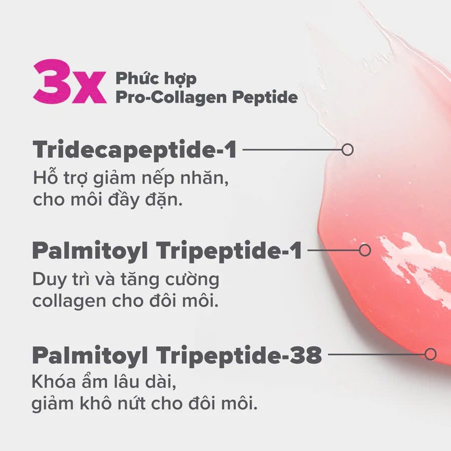 3x Pro-Collagen Peptides (Palmitoyl Tripeptide-1, Palmitoyl Tripeptide-38, Tridecapeptide-1): Phức hợp peptide đặc biệt hỗ trợ tái tạo collagen, giúp tăng cường độ đầy đặn và làm mờ nếp nhăn môi.