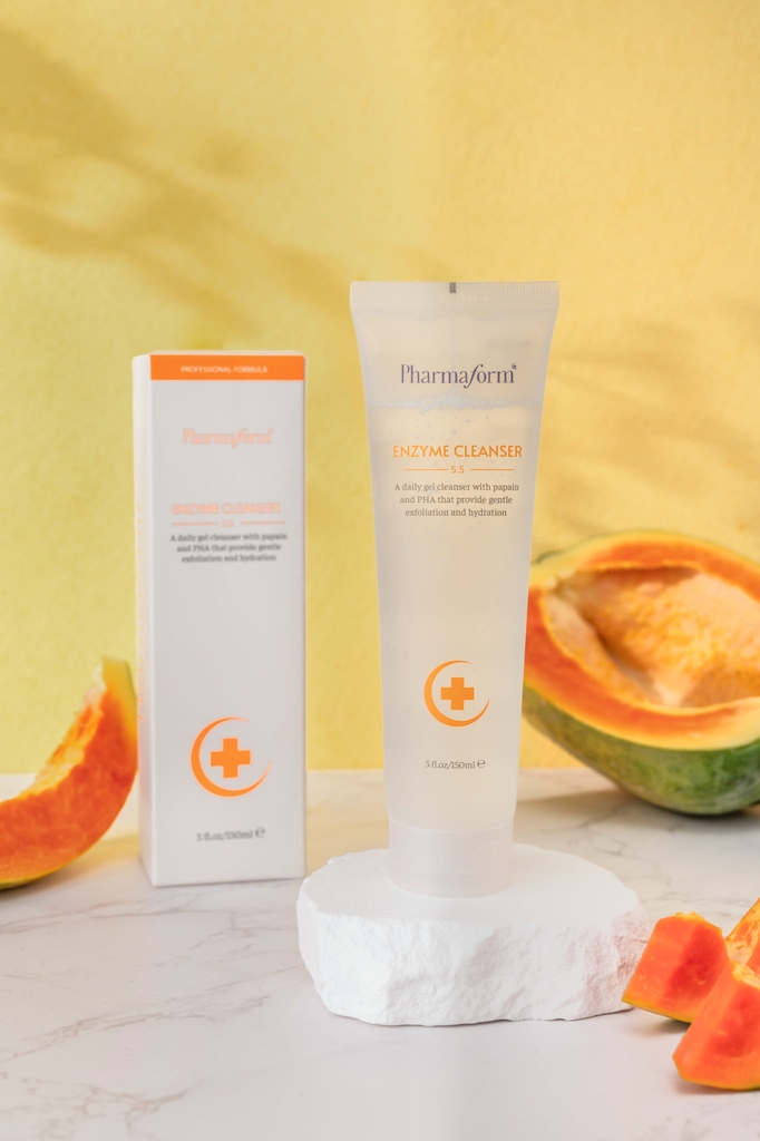 Pharmaform Enzyme Cleanser Gel là sữa rửa mặt dạng gel đa năng, mang lại tác động 3 trong 1: làm sạch nhẹ nhàng, tẩy tế bào chết dịu nhẹ và cung cấp độ ẩm cần thiết. Với pH cân bằng 5.5 lý tưởng cho làn da khỏe mạnh, sản phẩm loại sạch lớp trang điểm, bụi bẩn và bã nhờn mà không gây khô căng. Sự kết hợp của Enzyme Papain và PHA giúp tái tạo da, làm giảm mẩn đỏ và cải thiện vết thâm mụn, mang đến một làn da mềm mịn, tươi mới và ẩm mượt sau khi rửa mặt.