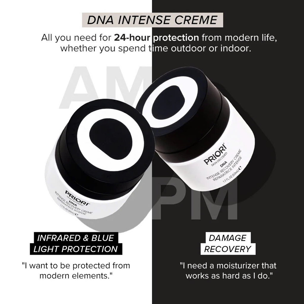 PRIORI DNA Intense Recovery Crème là một loại dầu dưỡng mềm mại, cung cấp khả năng bảo vệ da phổ rộng nâng cao chống lại các tác nhân gây căng thẳng từ môi trường, ánh sáng xanh và tia cực tím, mang lại sự chăm sóc xuống tận cấp độ DNA suốt 24 giờ. Công thức được xây dựng với các enzyme sửa chữa DNA công suất cao để giúp sửa chữa và phục hồi tổn thương da ở cấp độ tế bào. Kem dưỡng này hoạt động như một công thức đa dạng trong một, đáp ứng nhu cầu dưỡng ẩm và làm dịu làn da suốt cả ngày và đêm. Sản phẩm mang lại cảm giác mềm mại và mượt mà sang trọng, không để lại bóng dầu.
