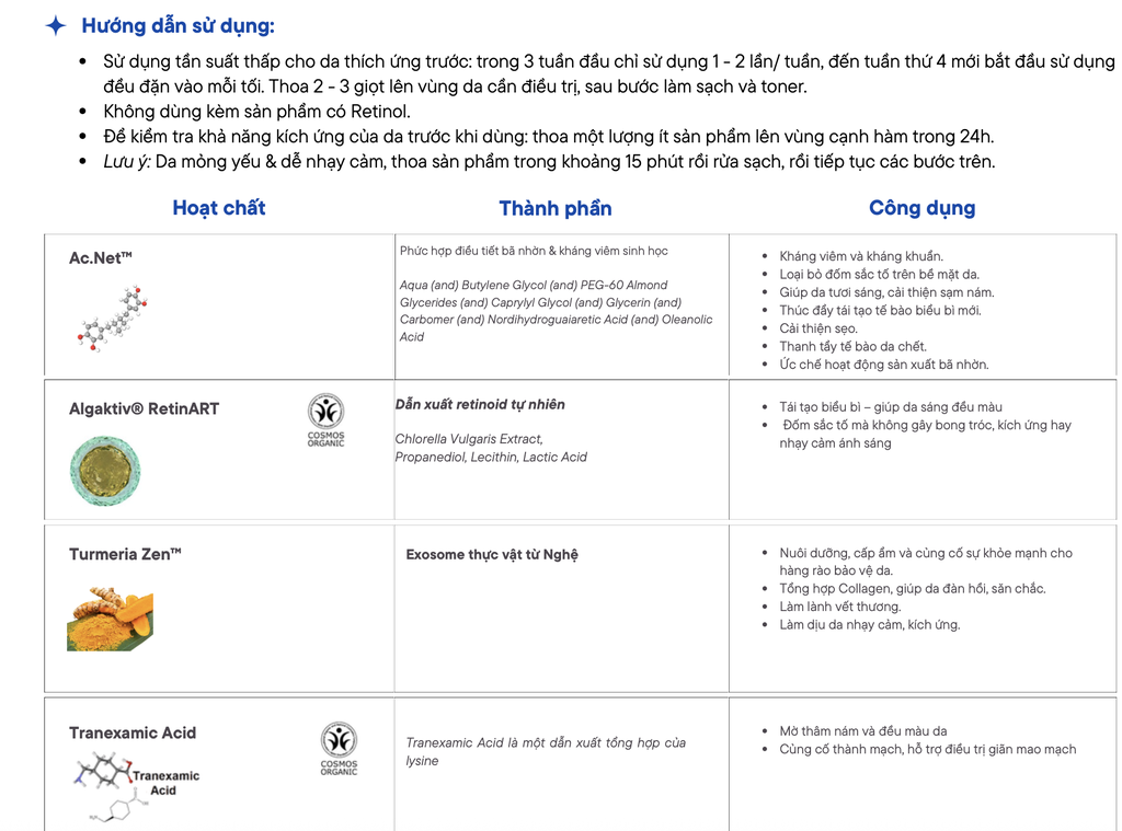 Tác Động Chống Mụn Đa Cơ Chế: Sự kết hợp của Ac.net™ (kiểm soát bã nhờn, điều hòa tế bào), Turmeria Zen™ (kháng khuẩn, điều tiết dầu) và Niacinamide hoạt động như một "kháng sinh sinh học" dọn sạch vi khuẩn C.Acnes và giải quyết triệt để vấn đề bít tắc.