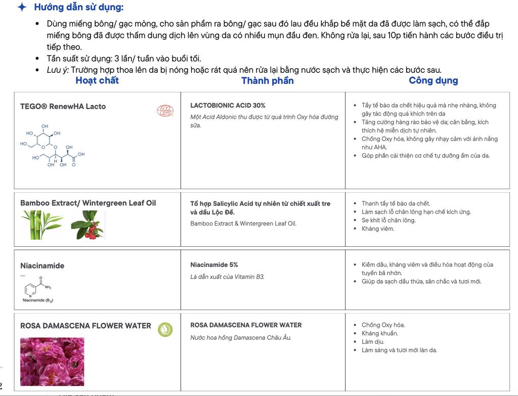 Lưu ý: Không cần rửa lại bằng nước. Sử dụng 3 lần/tuần vào buổi tối.