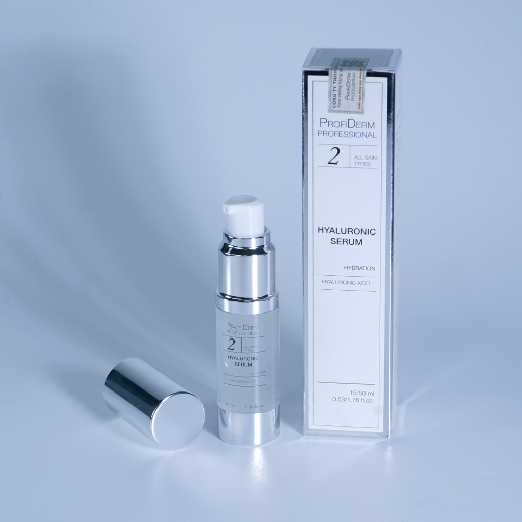 Profiderm Professional Hyaluronic Serum là huyết thanh cao cấp được thiết kế với công nghệ Hyaluronic Acid đa phân tử. Sản phẩm kết hợp 4 loại Hyaluronic Acid (HA) có trọng lượng phân tử khác nhau, tạo nên một \"bể chứa nước sinh học\" giúp duy trì độ ẩm và cấu trúc nền của mô da. Serum không chỉ cấp ẩm tức thì trên bề mặt mà còn thẩm thấu sâu vào các tầng da, giúp nuôi dưỡng Collagen, Elastin và phục hồi hàng rào bảo vệ da khỏe mạnh từ bên trong.