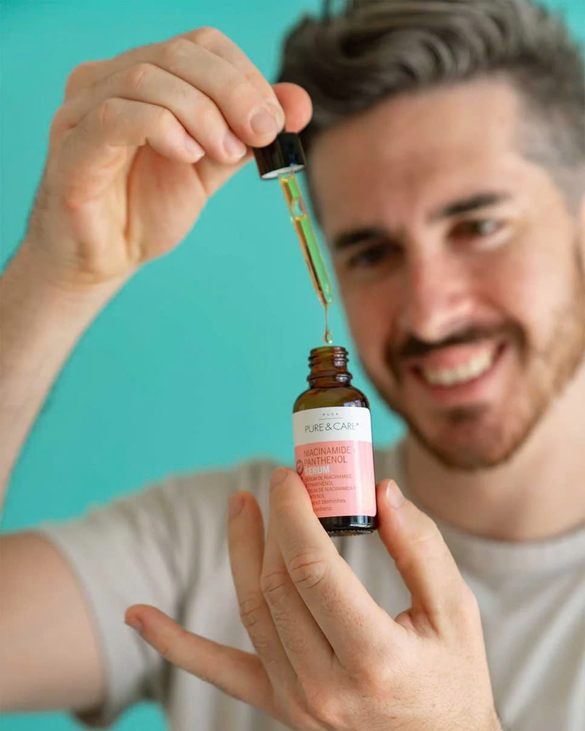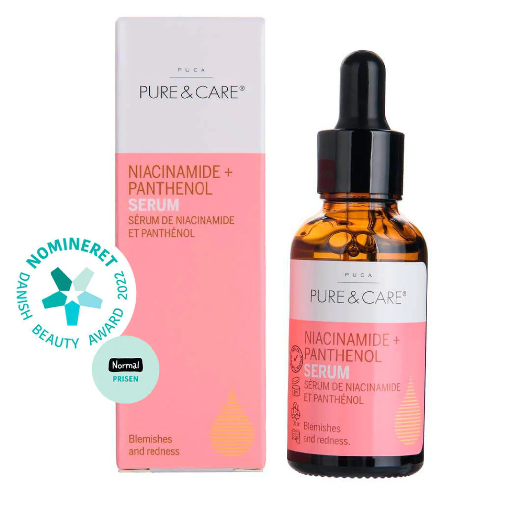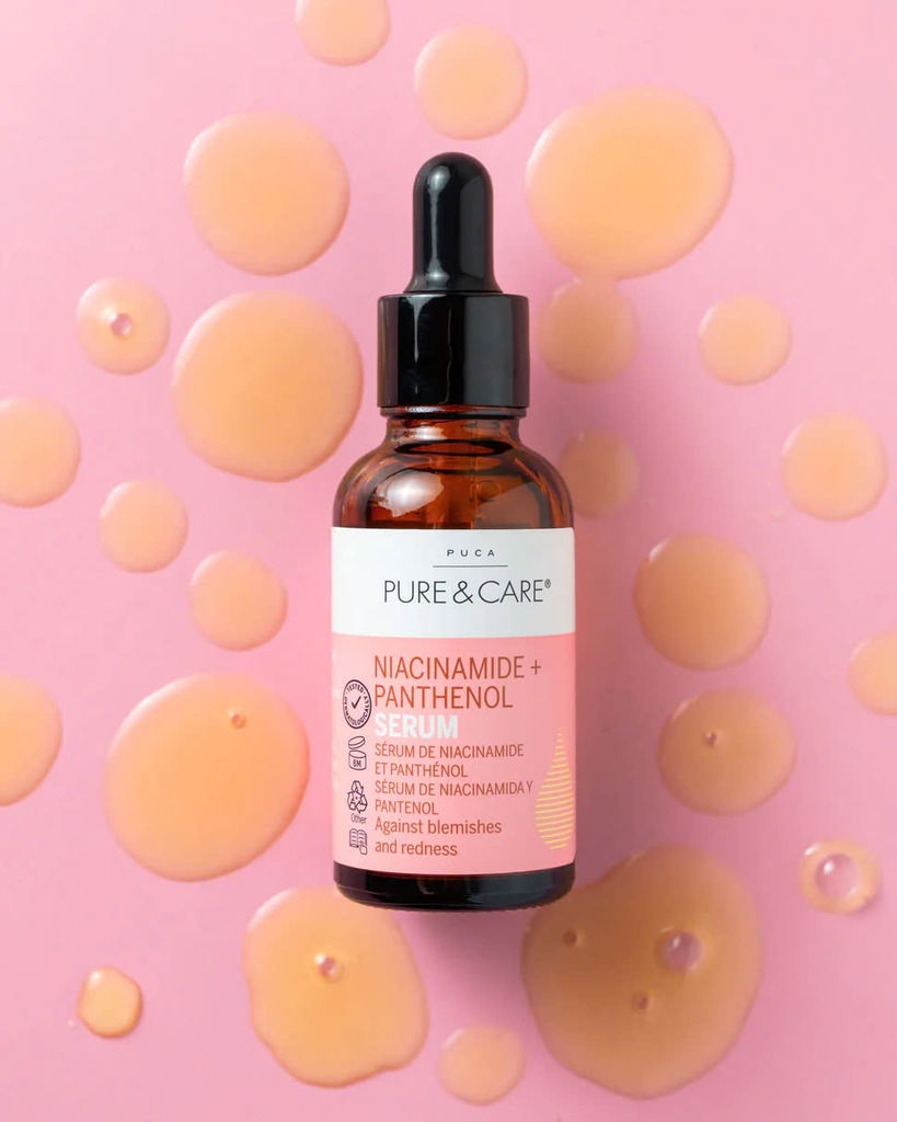 Tinh chất Niacinamide Panthenol - PURE & CARE kết hợp vitamin B3 và B5 (D-Panthenol) giúp giảm dầu thừa, mụn và mẩn đỏ hiệu quả. Sản phẩm có chứa thêm peptide giúp da tái tạo collagen và thể tích. Ngoài ra, huyết thanh này còn chứa hỗn hợp chiết xuất thực vật giúp làm dịu da, phục hồi da bị tổn thương và cung cấp khả năng bảo vệ chống oxy hóa. Sản phẩm làm giảm nếp nhăn và tình trạng mất nước của da. Nếu bạn muốn tăng hiệu quả của sản phẩm, bạn có thể sử dụng với huyết thanh EGF Peptide/huyết thanh Hyaluronic Acid của PUCA PURE & CARE và huyết thanh tẩy tế bào chết BHA/AHA.
