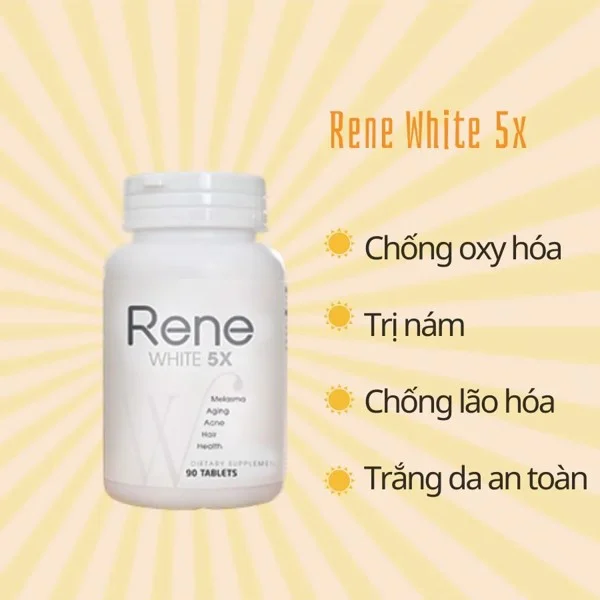 Viên uống trắng da Rene White 5X là dòng sản phẩm dưỡng trắng da mạnh mẽ với khả năng dưỡng trắng da gấp 5 lần so vứoi các sản phẩm trắng da cùng loại. Bạn sẽ có làn da trắng sáng toàn thân toàn diện sau khi sử dụng sản phẩm này trong một thời gian ngắn. Bằng việc ngăn ngừa yếu tốt cốt lõi của việc da sạm màu là ức chế ngay thời điểm ban đầu khi chuẩn bị hình thành hắc tố Melanin.